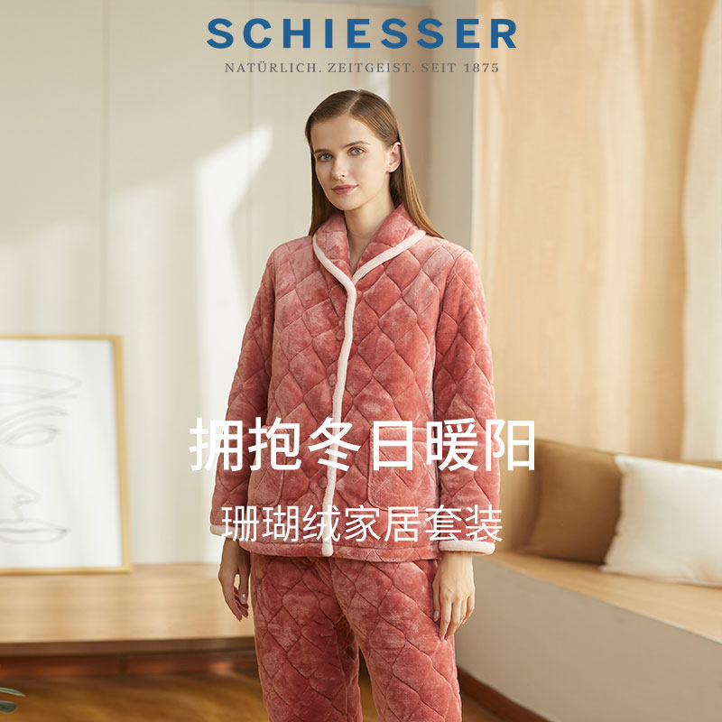 SCHIESSER舒雅菱格珊瑚绒加绒加厚休闲女士睡衣家居服套装20553H