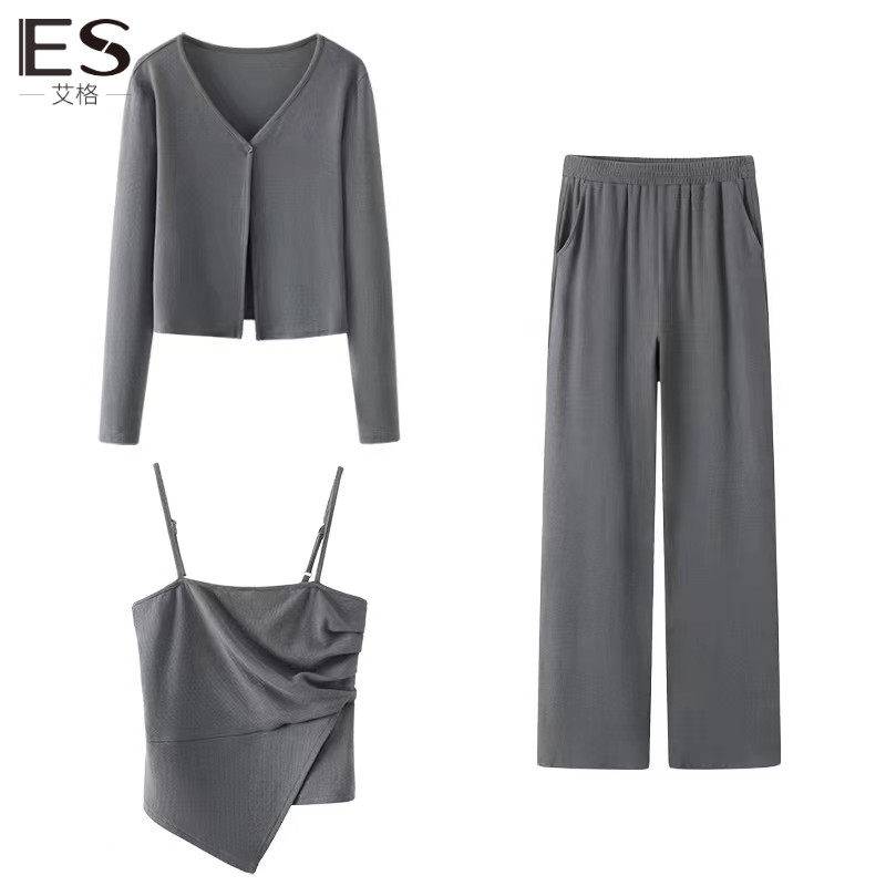 Etam艾格ES灰色针织套装女2024春季新款吊带开衫阔腿裤休闲三件套