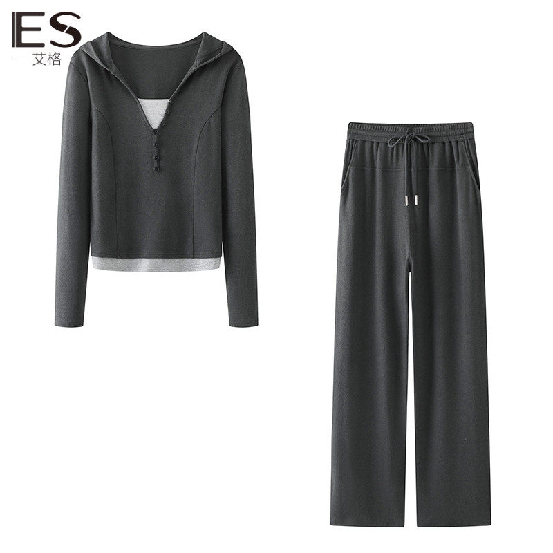 艾格ES2024春季新款两件套休闲套装假两件卫衣宽松上衣直筒裤长裤
