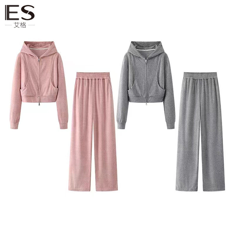 艾格/Etam2024早春新款慵懒连帽短卫衣可束脚针织阔腿裤休闲套装