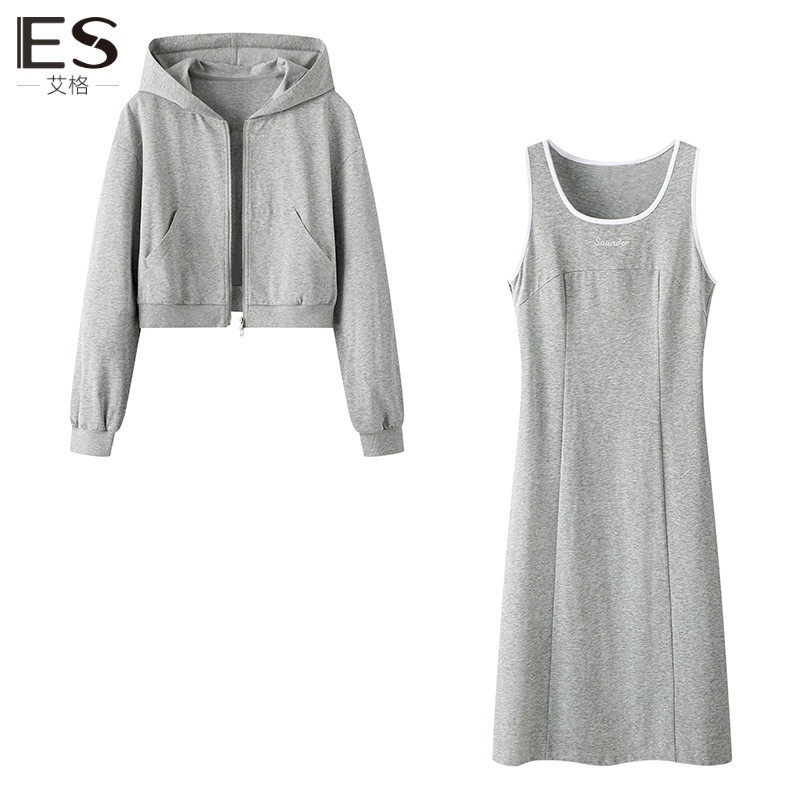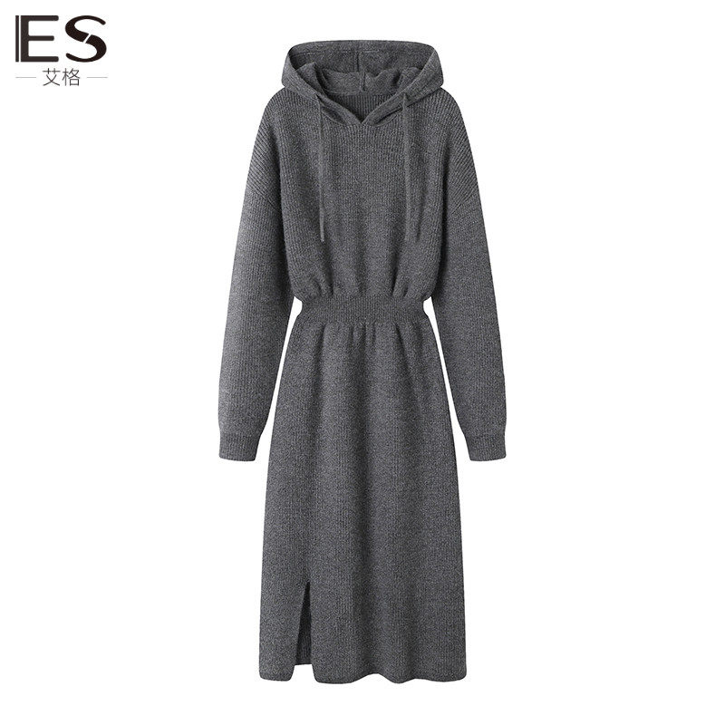艾格灰色连帽毛衣连衣裙女2023新款秋冬季收腰假两件卫衣裙长裙子