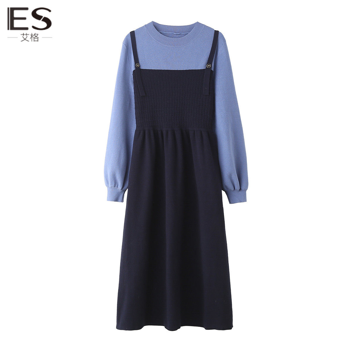 艾格蓝色背带裙假两件连衣裙女2023秋冬新款撞色针织毛衣裙长裙子