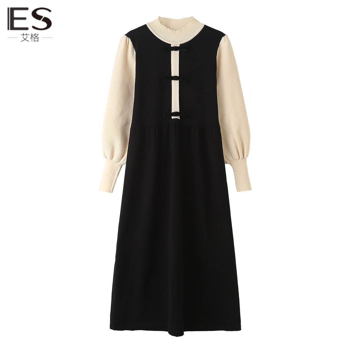 艾格ES假两件毛衣针织连衣裙女2023新款秋冬季蝴蝶结半高领长裙子