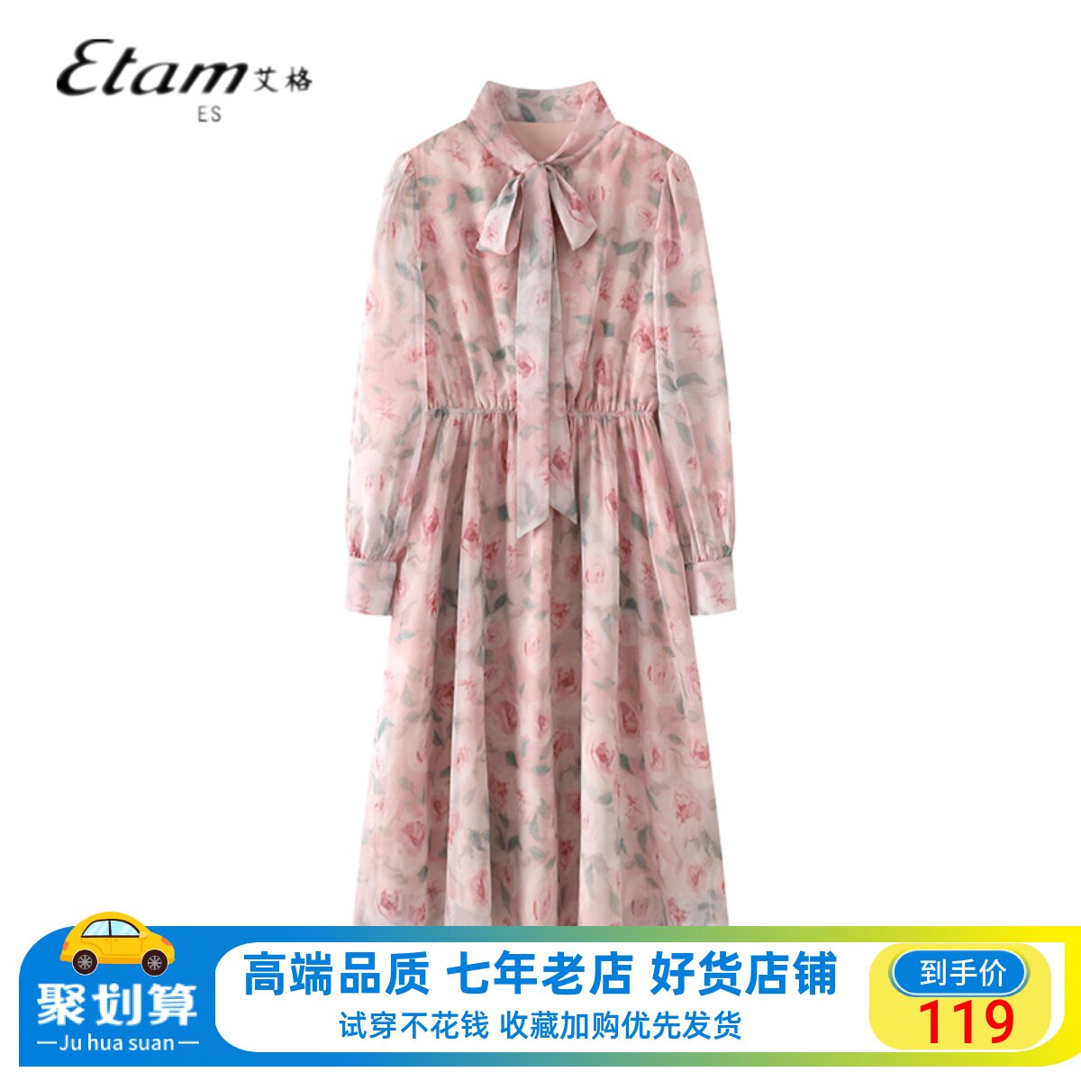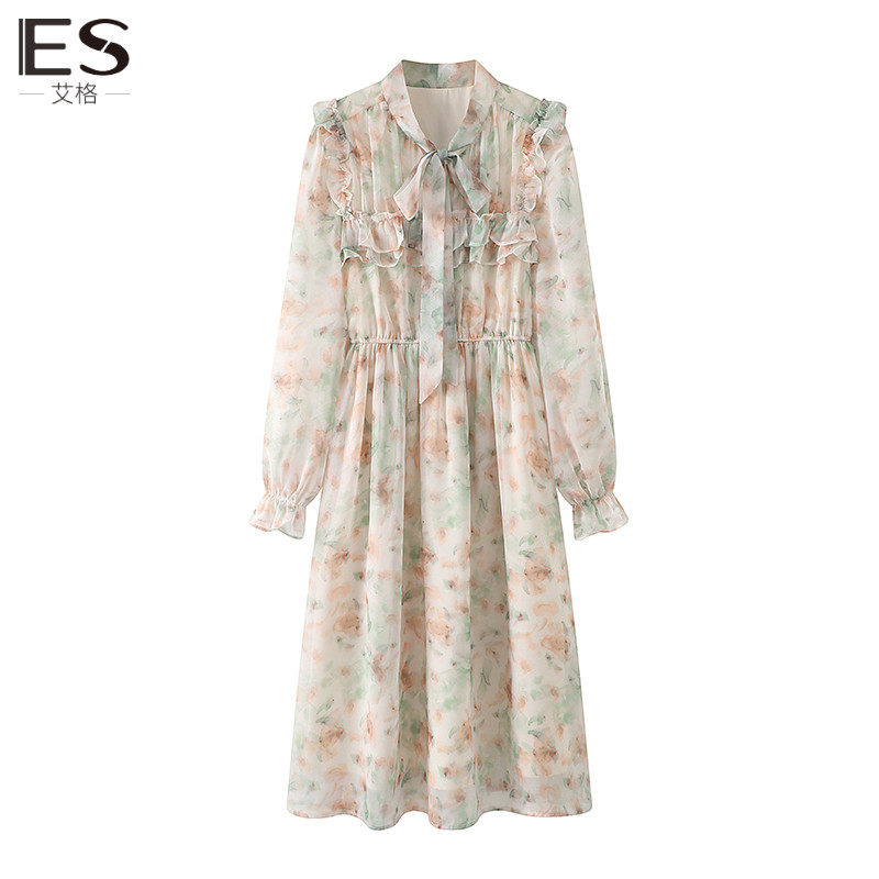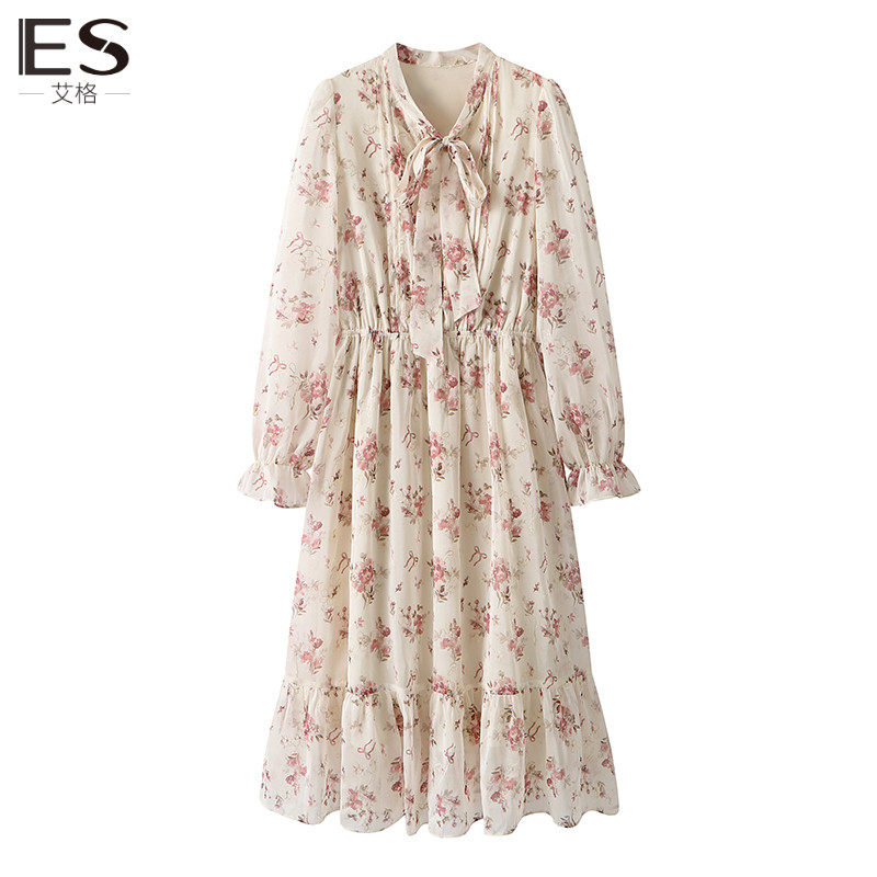Etam/艾格ES长袖碎花连衣裙女2023秋季新款气质高腰系带雪纺裙子