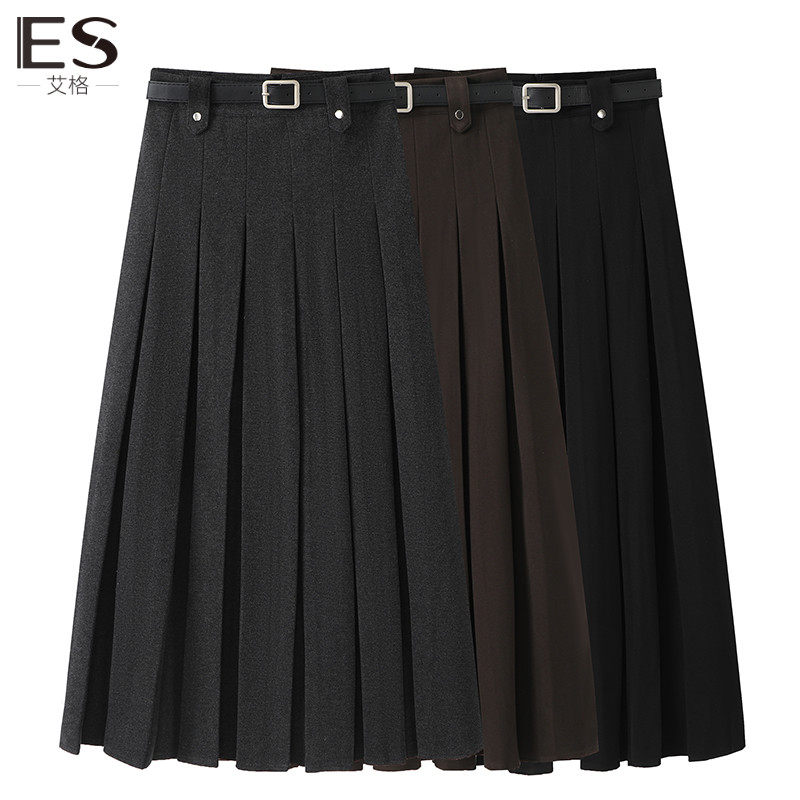 艾格ES黑灰色百褶裙薄毛呢半身裙女2023秋冬新款a字高腰长裙子