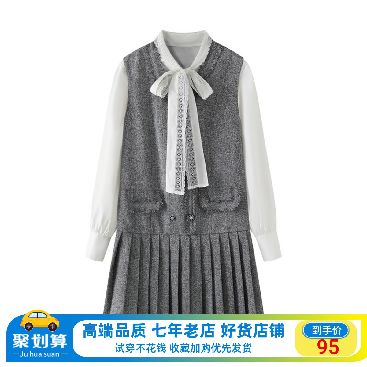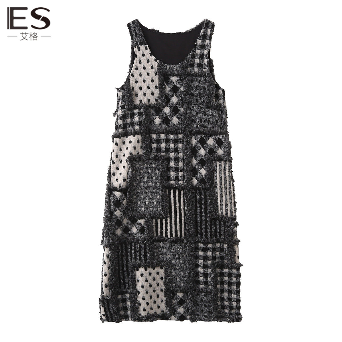 艾格复古拼接连衣裙毛呢裙2023秋冬季新款女马甲背心裙格子长裙子
