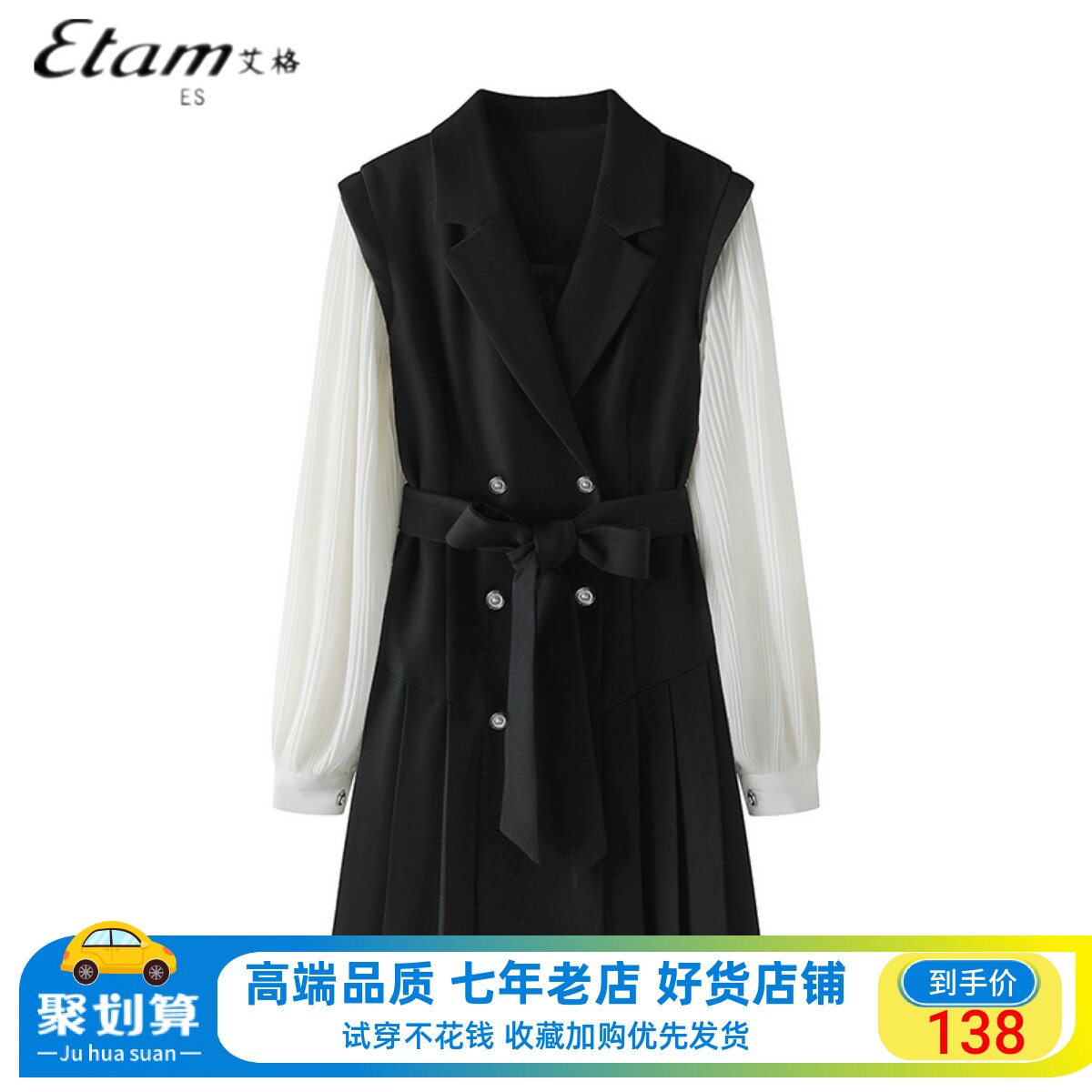 艾格设计感黑色西装连衣裙女2024春季新款假两件收腰气质女士裙子