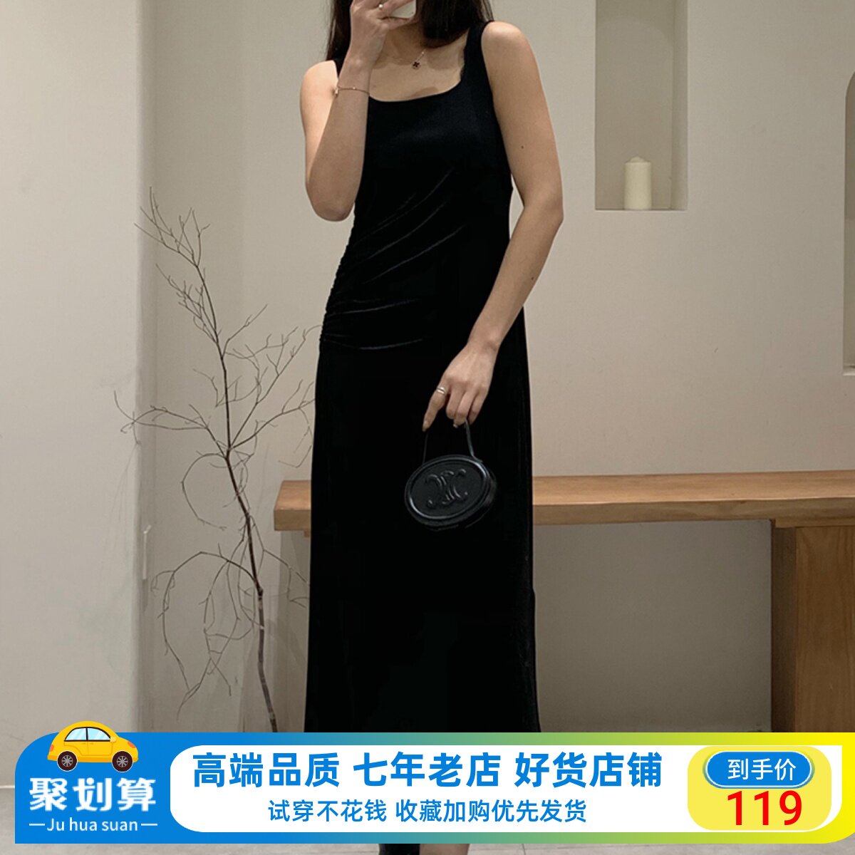 范艾诺丝裙子2024春新款黑色褶皱收腰显瘦无袖吊带连衣裙40129051