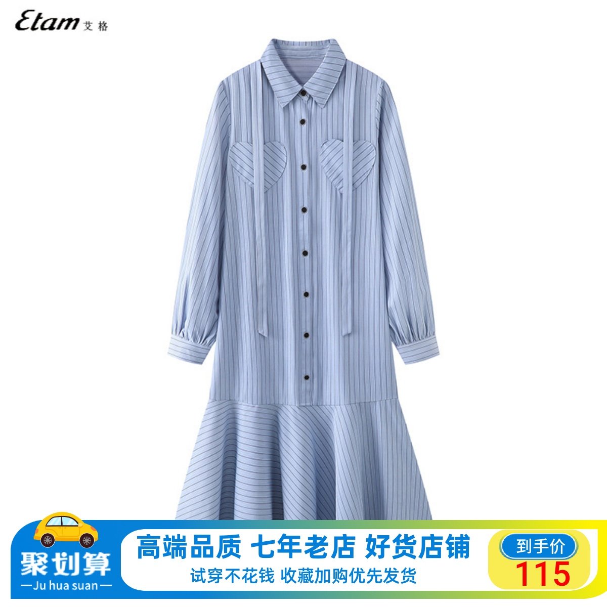 艾格蓝色条纹鱼尾裙拼接衬衫连衣裙女2024早春款百搭长款衬衣裙子
