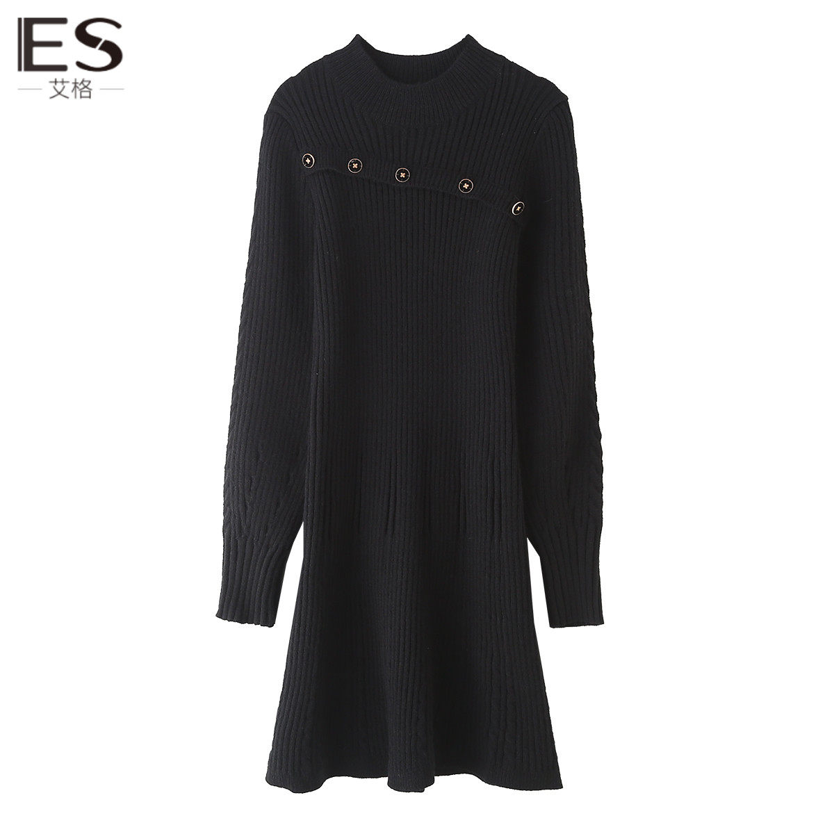 艾格黑色半高领打底针织连衣裙女2023秋冬季新款内搭短裙子毛衣裙