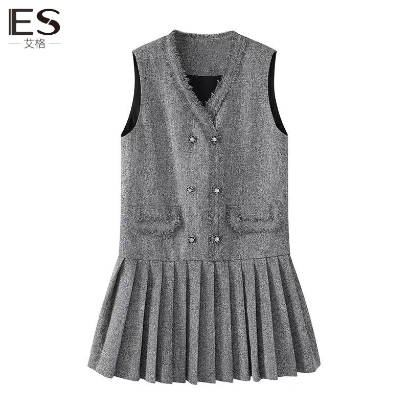 艾格无袖背心连衣裙女2024春季新款慵懒小香风百褶裙子中长款马甲