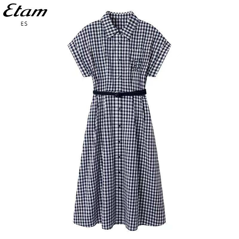 Etam/艾格ES 格子连衣裙女2023新款刺绣收腰翻领港味复古chic裙子