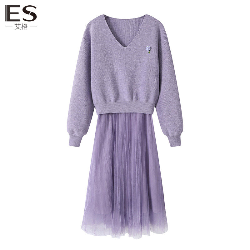 艾格ES紫色显瘦时尚休闲套装女2023秋装新款针织衫网纱裙子两件套