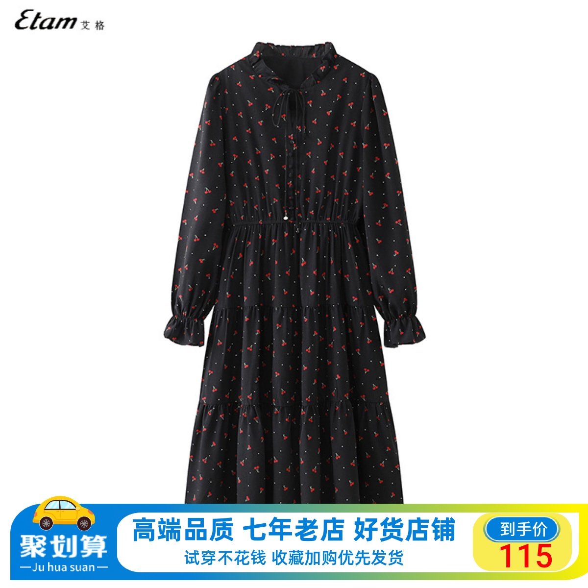 艾格v领裙子2024春新款轻奢名媛长袖黑色樱桃碎花收腰气质连衣裙
