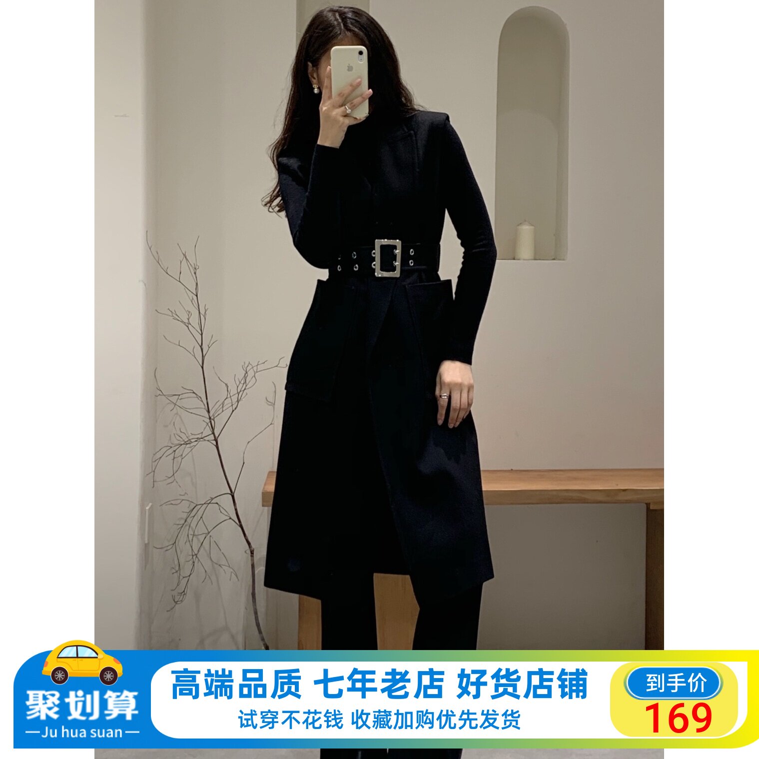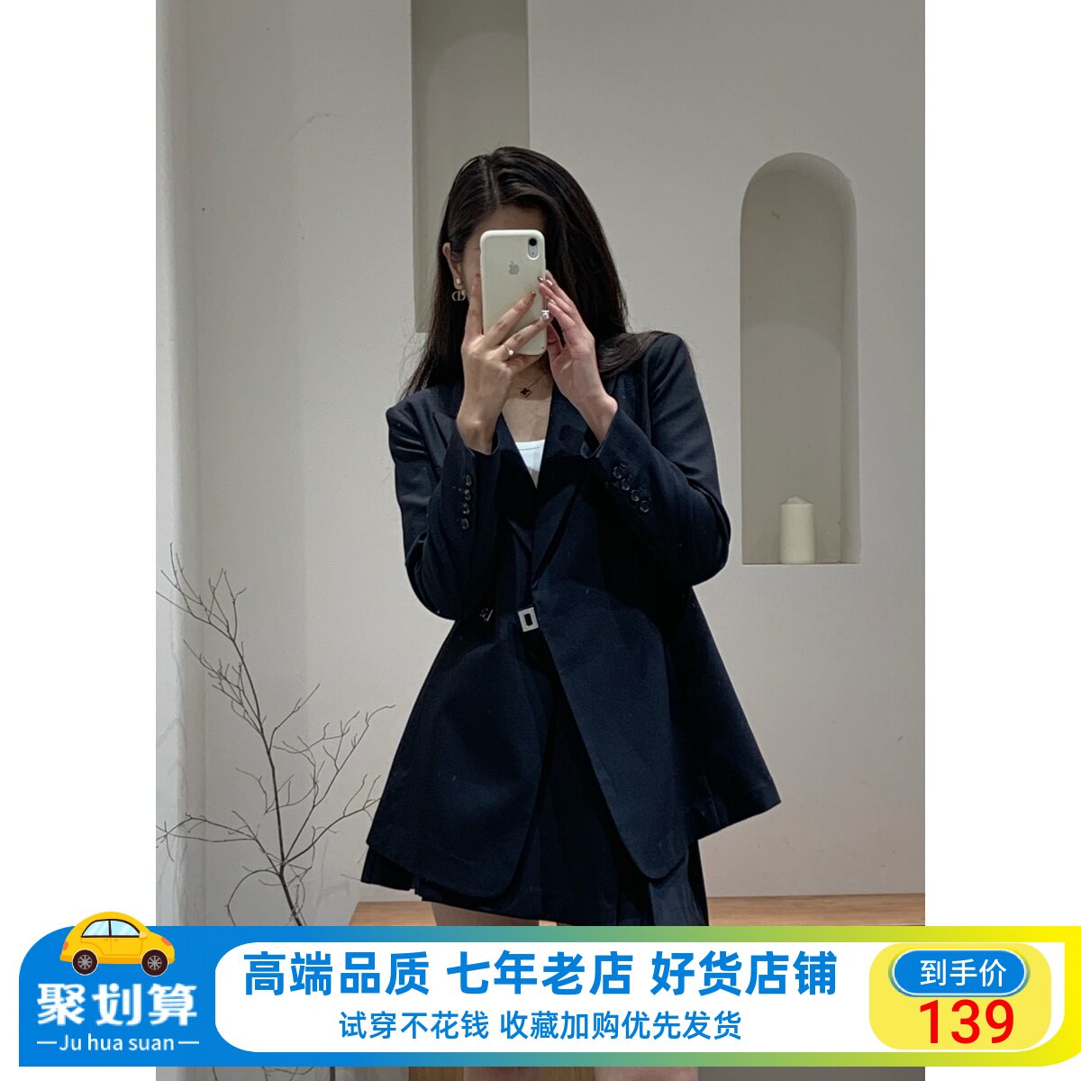 艾格设计感黑色西装连衣裙女2024春季新款假两件收腰气质女士裙子
