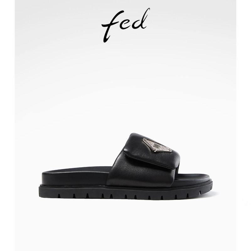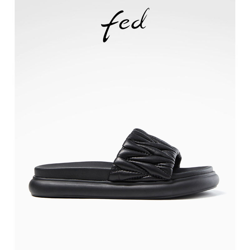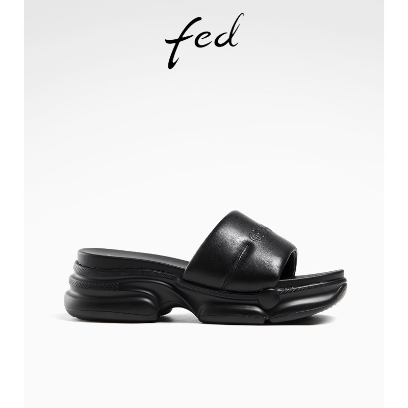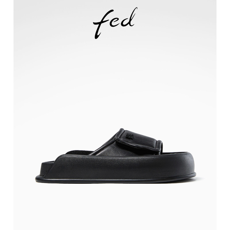 fed厚底凉拖鞋夏季新款女鞋黑色真皮软底休闲一字拖女R0603-ZF016