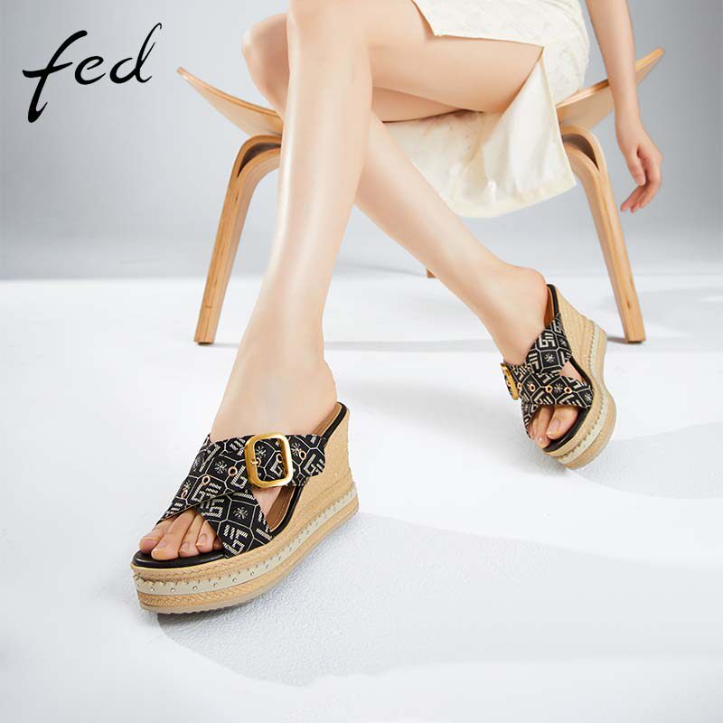 fed坡跟凉鞋夏季新款女鞋气质鱼嘴松糕厚底凉拖鞋女R0704-ZFA008
