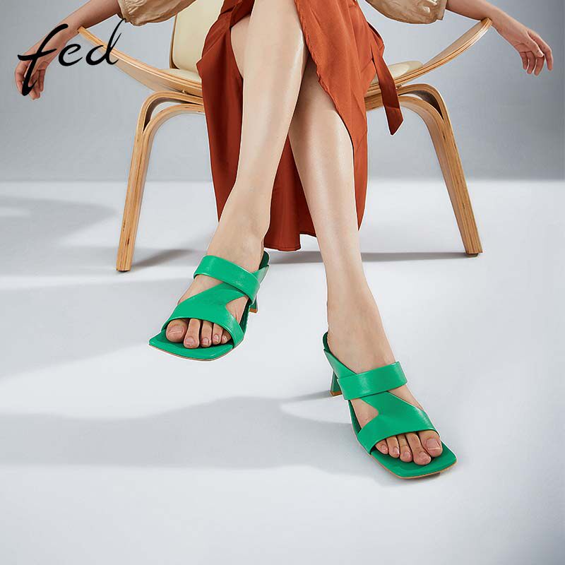 fed高跟拖鞋新款真皮气质绿色方头女士高级法式凉拖鞋514-ZC628