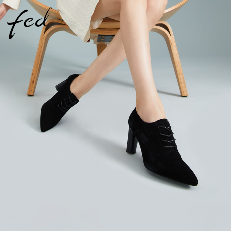 fed粗跟高跟鞋2023年春季新款女鞋反绒尖头复古单鞋R0213-ZFA001