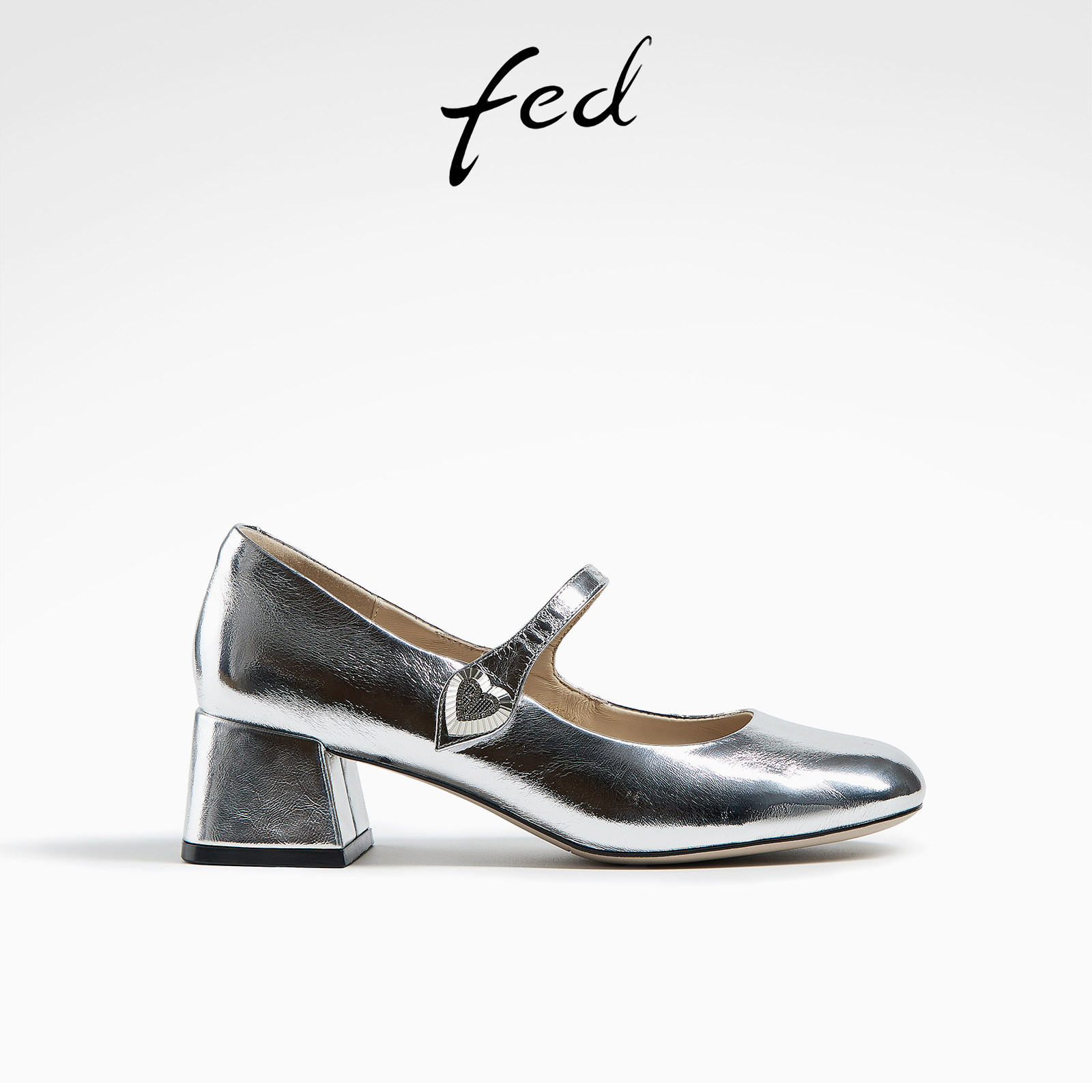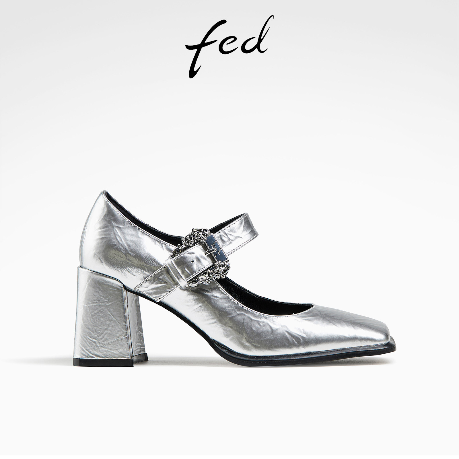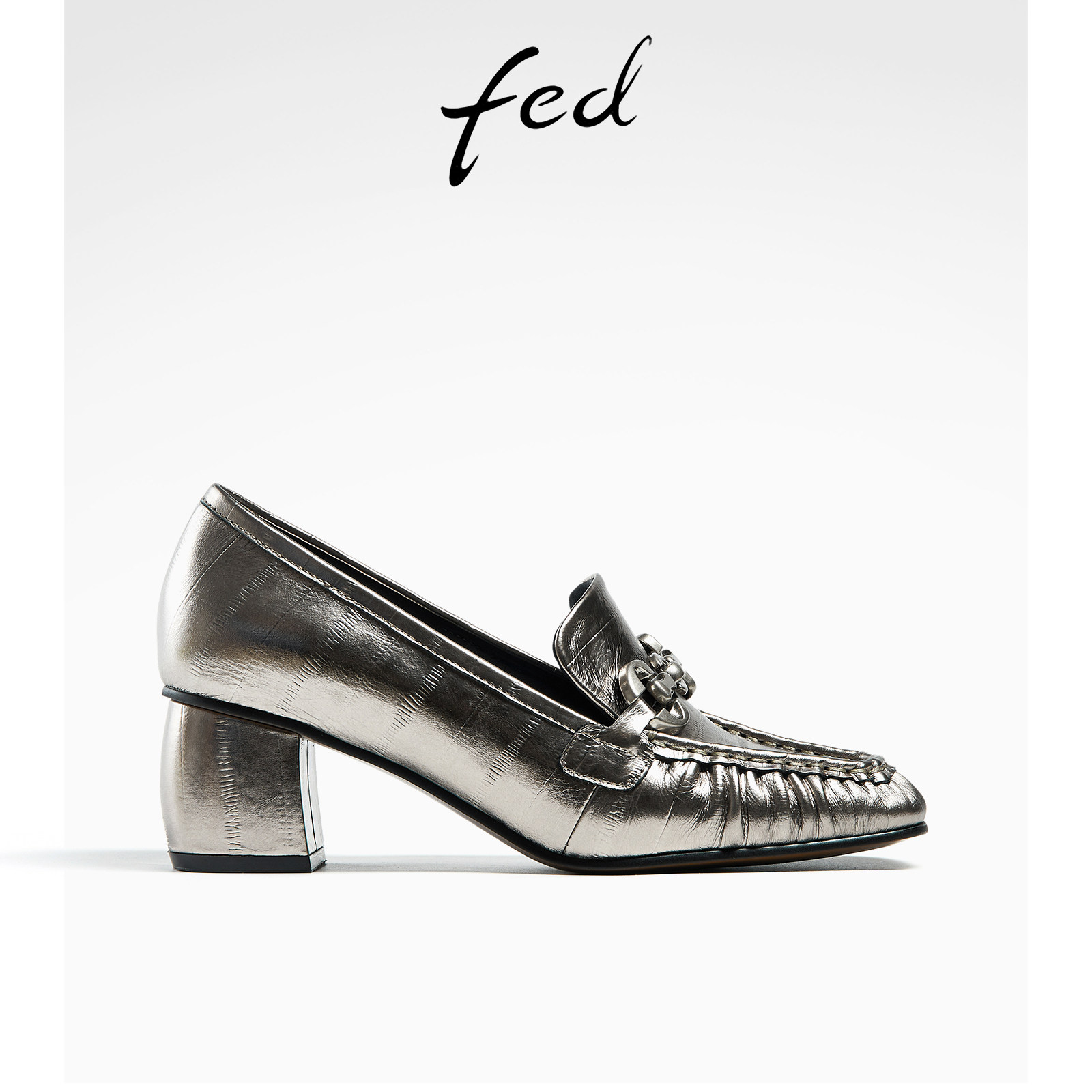 fed商场同款粗跟单鞋秋季新款女鞋真皮银色高跟鞋R0913-YAB291