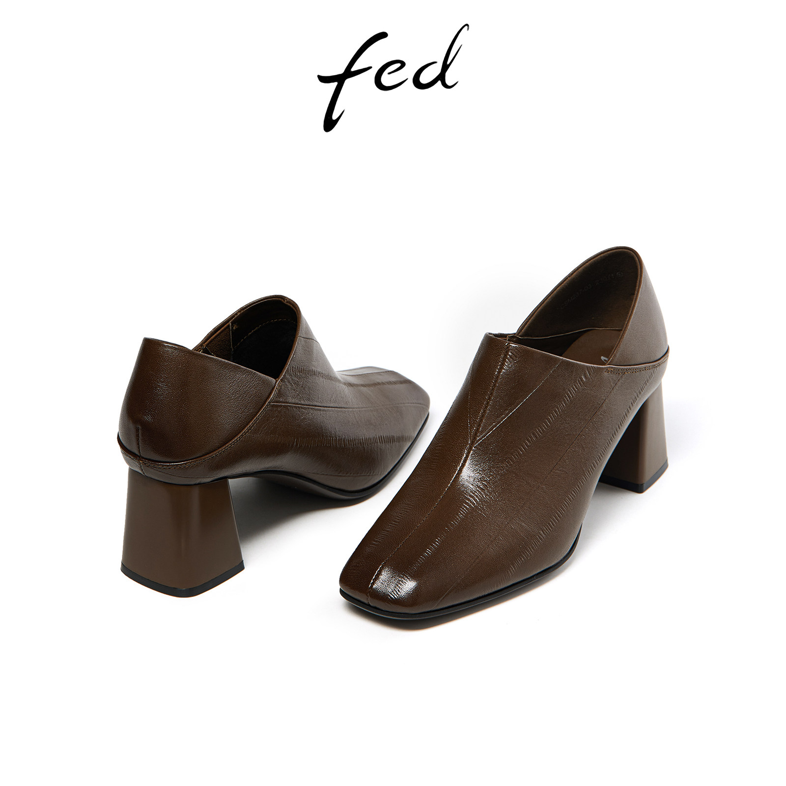 fed方头单鞋春季新款女鞋气质真皮鞋棕色高跟鞋女款D0224-ZCA215