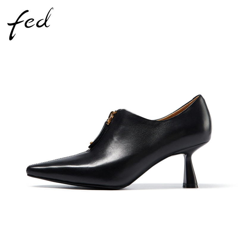 fed法式高跟鞋秋季新款女鞋真皮细跟气质裸靴尖头单鞋830-YAB387
