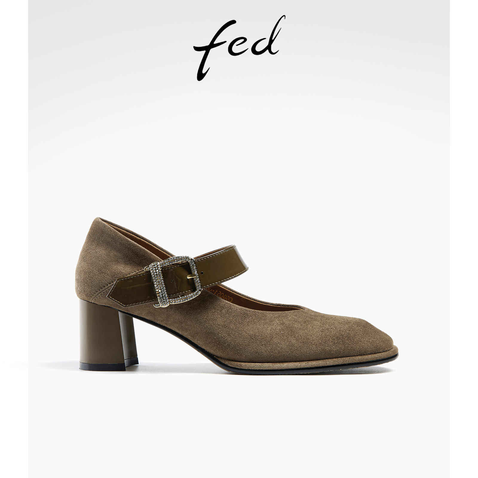 fed玛丽珍鞋秋季新款女鞋绒面复古粗跟高跟浅口单鞋R0731-YAB051
