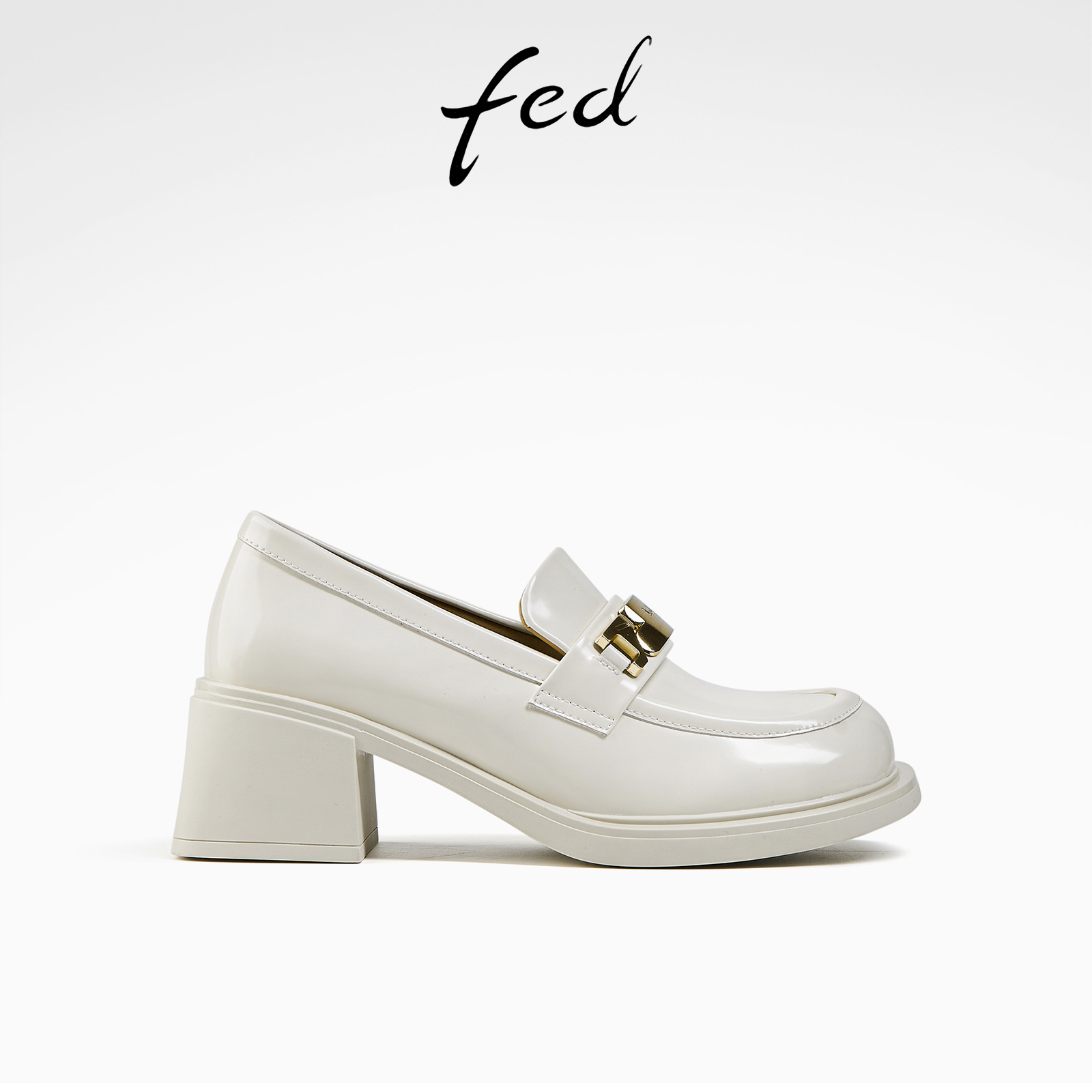 fed白色真皮鞋春季新款女鞋厚底乐福鞋高跟单鞋女款D0221-YAB250