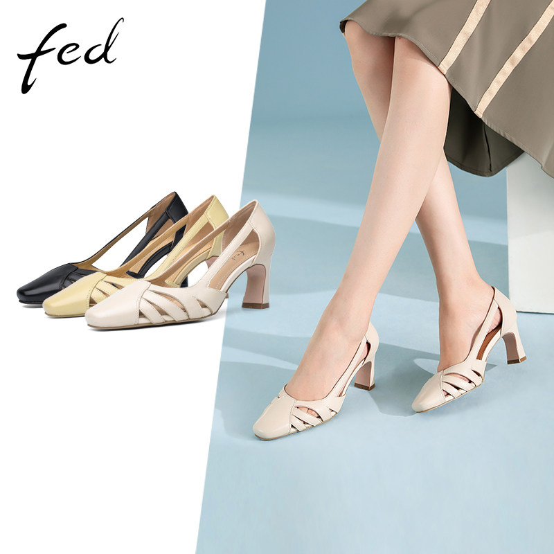 fed通勤高跟鞋女夏季新款女鞋浅口真皮方头细跟单鞋R0402-ZFA019