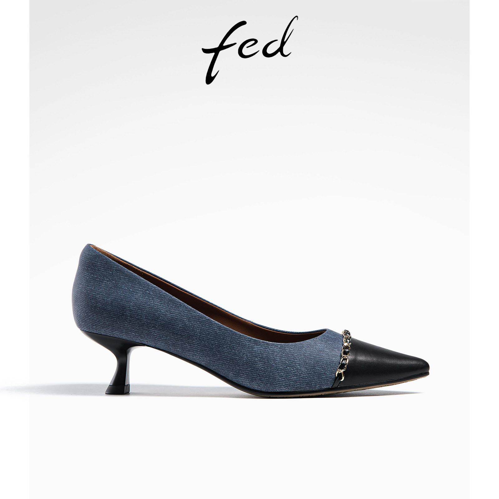 fed浅口单鞋秋季新款女鞋时尚拼色链条尖头高跟鞋女款R0814-YA723