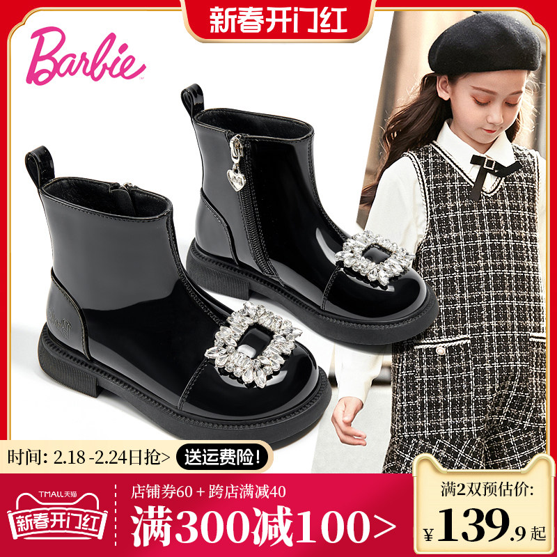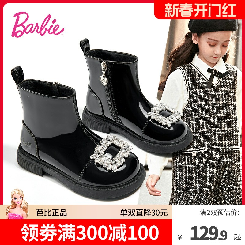芭比女童水钻公主时装马丁靴女2023新款冬季加绒二棉小皮棉靴正品