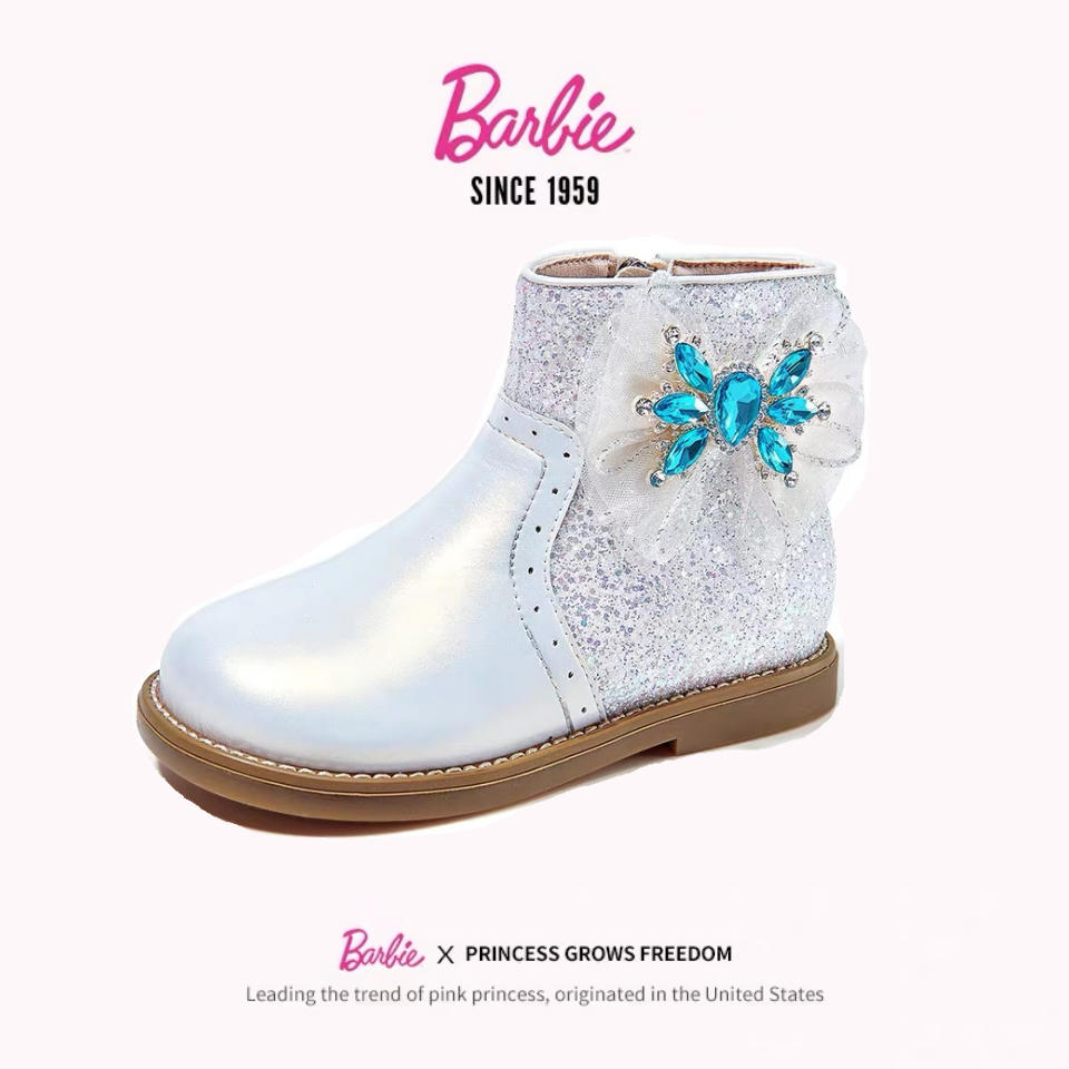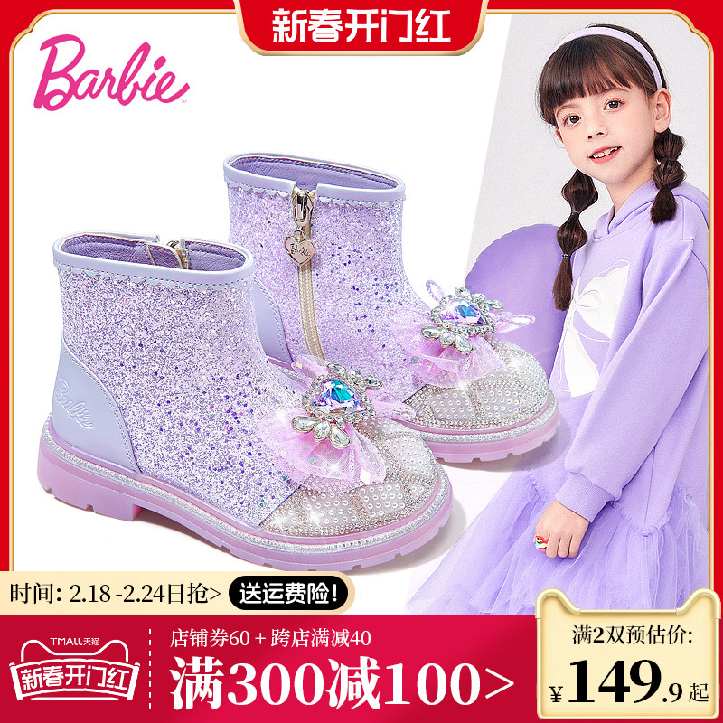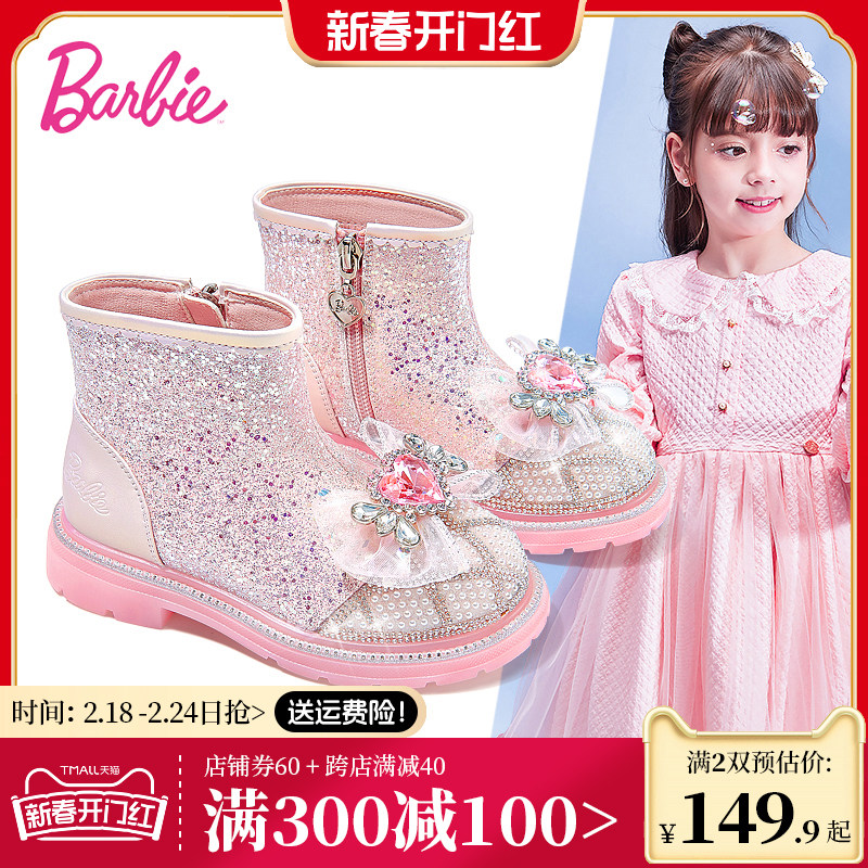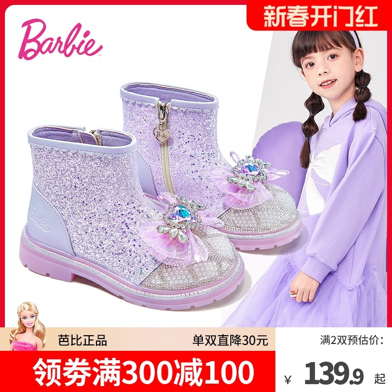 芭比童鞋儿童靴子2023新款秋冬小女孩水晶鞋加绒马丁靴女童公主靴