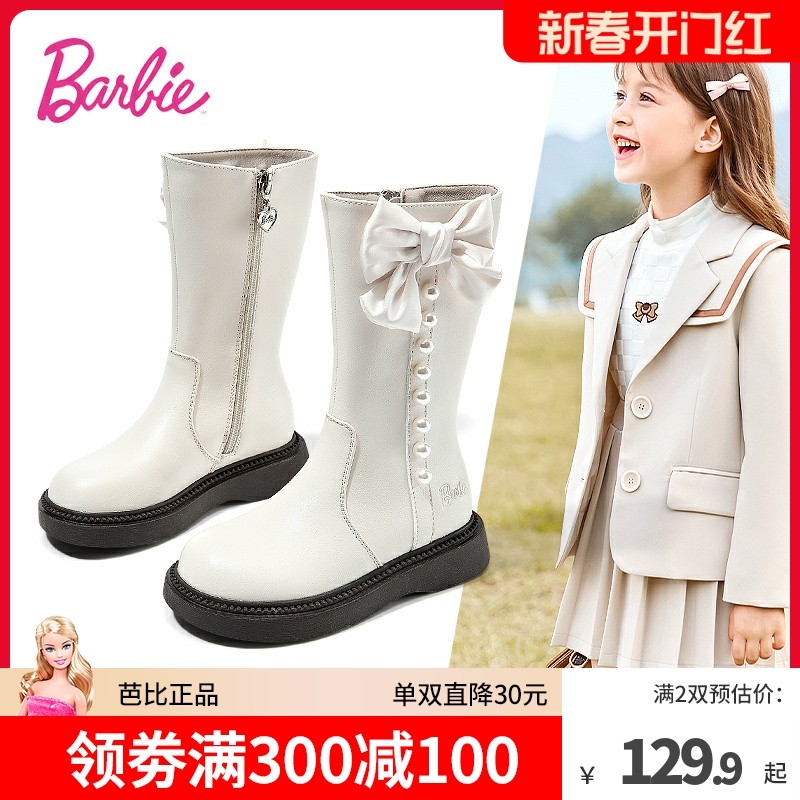 芭比童鞋女童靴子2023新款冬季加绒儿童中筒靴皮靴女童马丁靴