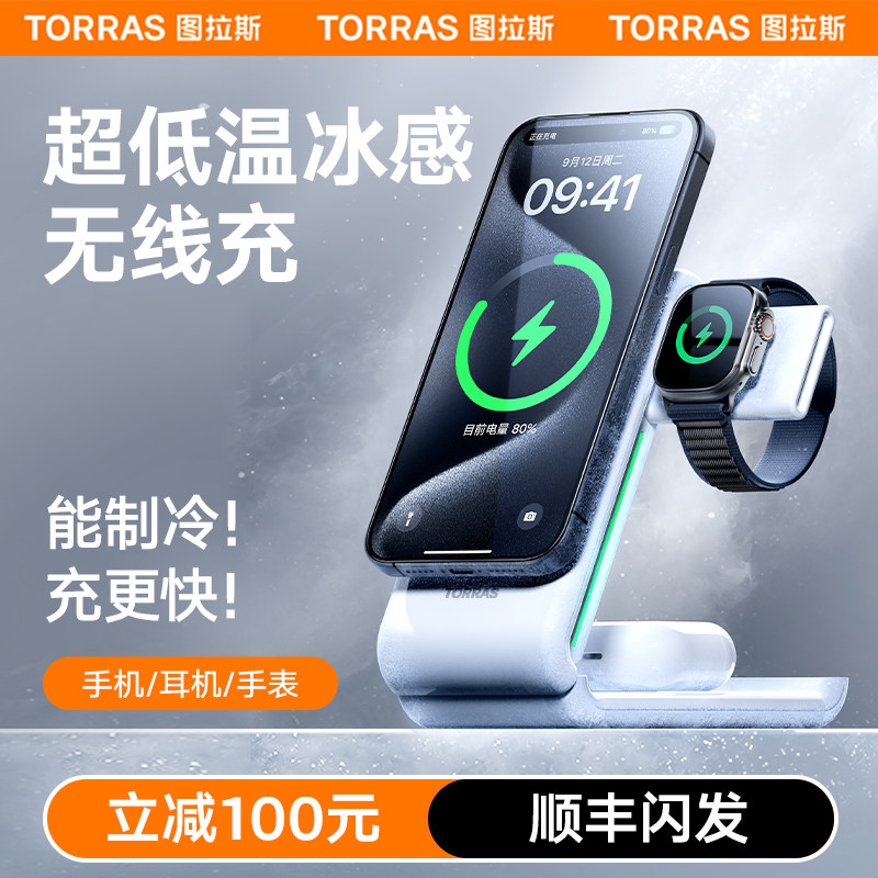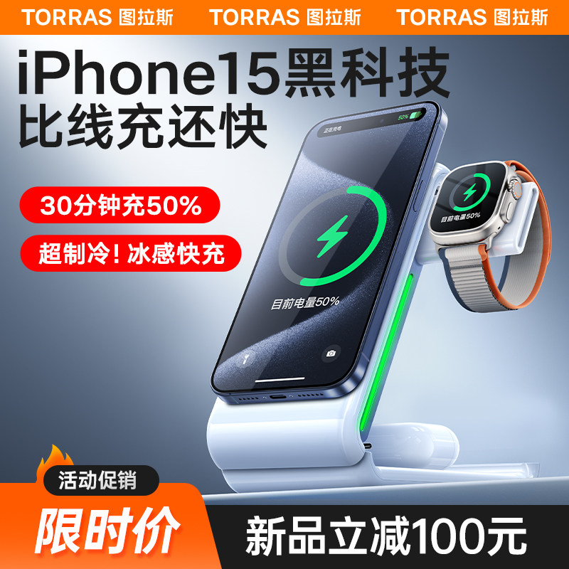 图拉斯快充适用苹果15三合一无线充电器座Magsafe磁吸iPhone15ProMax手机iWatchS9支架14耳机手表专用Ultra2