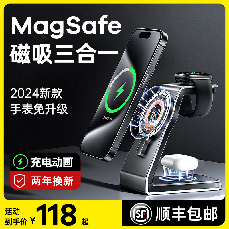 三合一无线充电器支架适用apple watch手表iwatch苹果15充电座iphone14快充磁吸magsafe底座airpods蓝牙耳机
