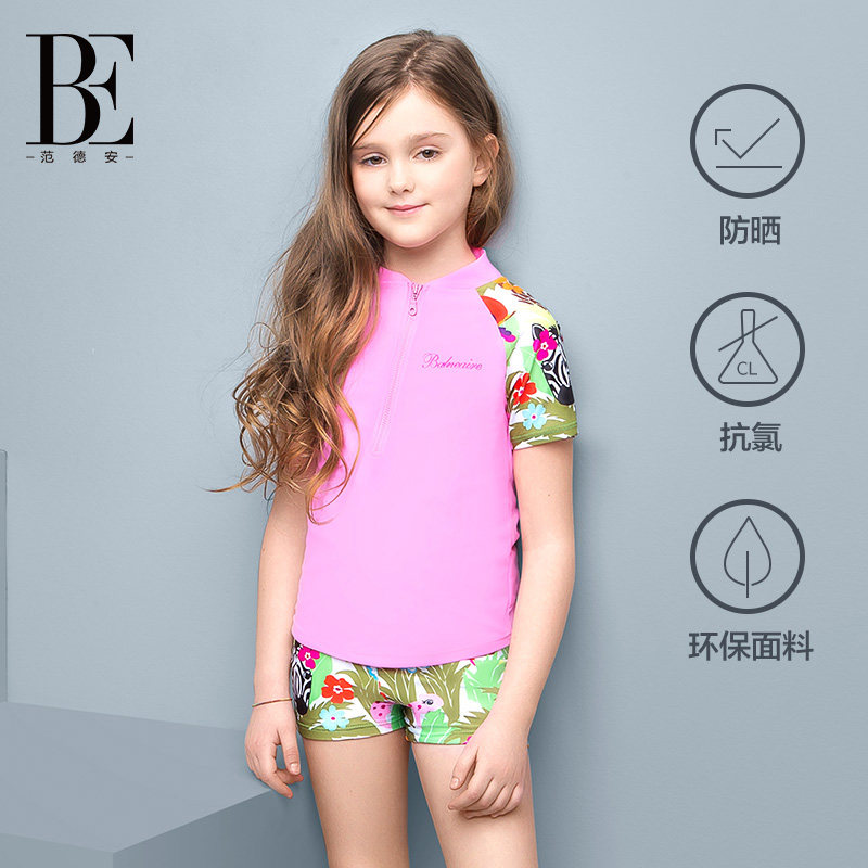 BE范德安儿童分体泳衣女童短袖抗氯防晒可爱平角学生游泳疏水速干