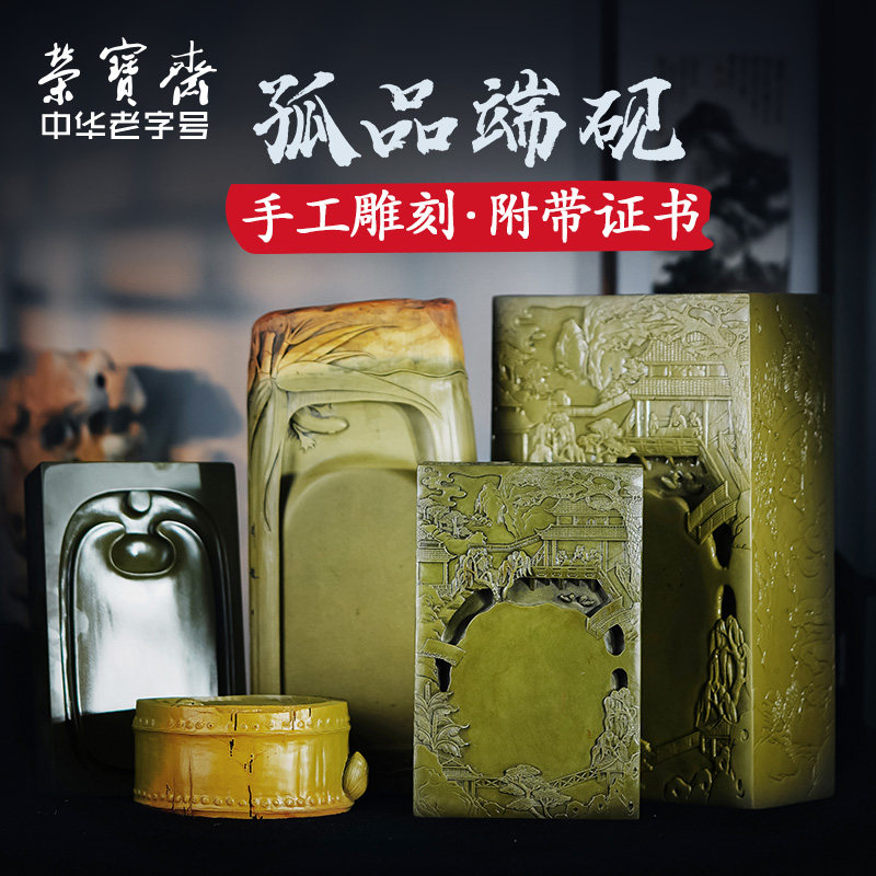 荣宝斋砚台孤品文房四宝毛笔书法国画墨锭墨汁天青蕉叶白青花原石精雕手工精品老坑端砚礼盒