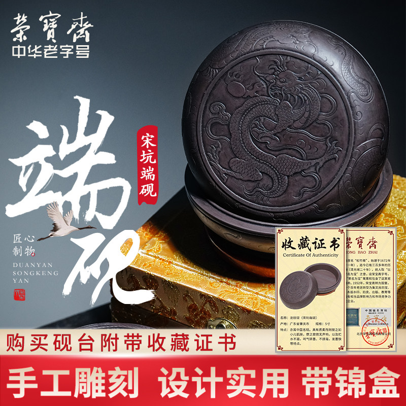 荣宝斋孤品砚台文房四宝毛笔书法国画原石精雕手工精品素砚宋坑竹编龙纹端砚礼盒