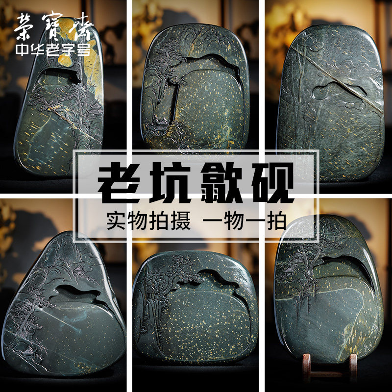 荣宝斋老坑孤品歙砚水波纹金星金晕原石砚台文房四宝研墨条书法国画手工精雕天然砚石礼盒送礼