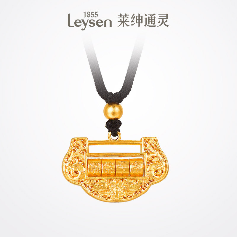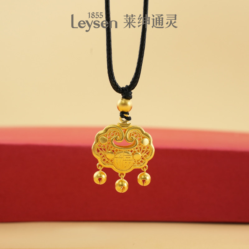 莱绅通灵珠宝 传世金计价 岁岁平安锁 999足金黄金吊坠 黑绳项链