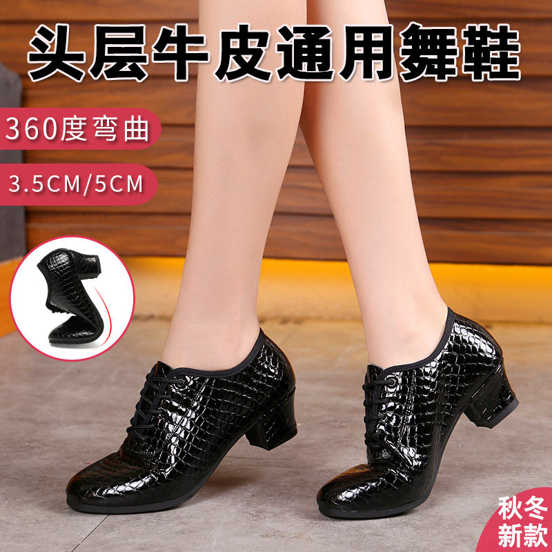 真皮新款跳舞鞋女士软底拉丁舞鞋成人交谊广场舞蹈鞋中跟摩登秋冬