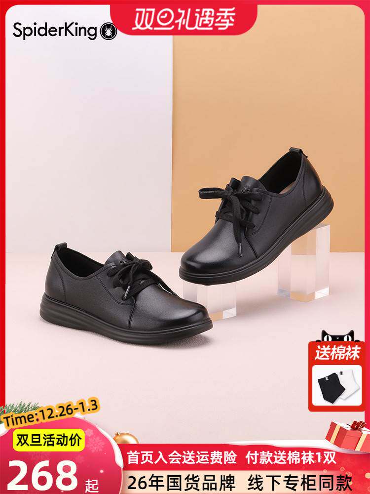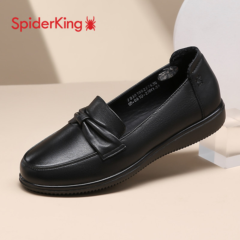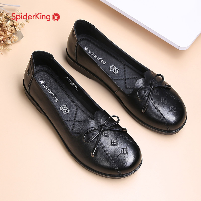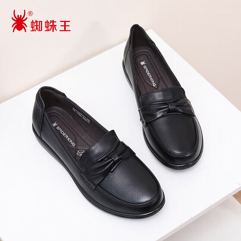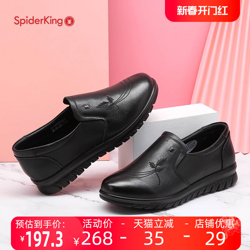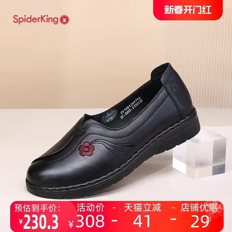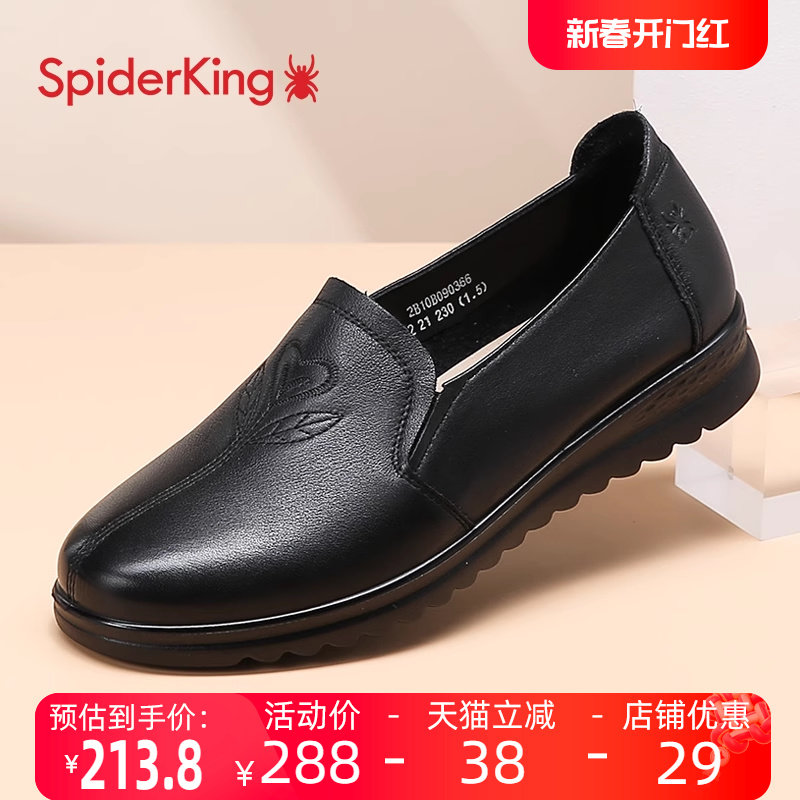蜘蛛王女鞋秋款女士真皮浅口妈妈平底单鞋防滑中老年人舒适皮鞋