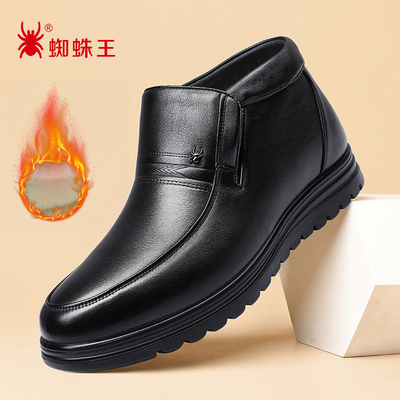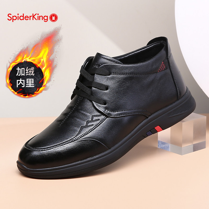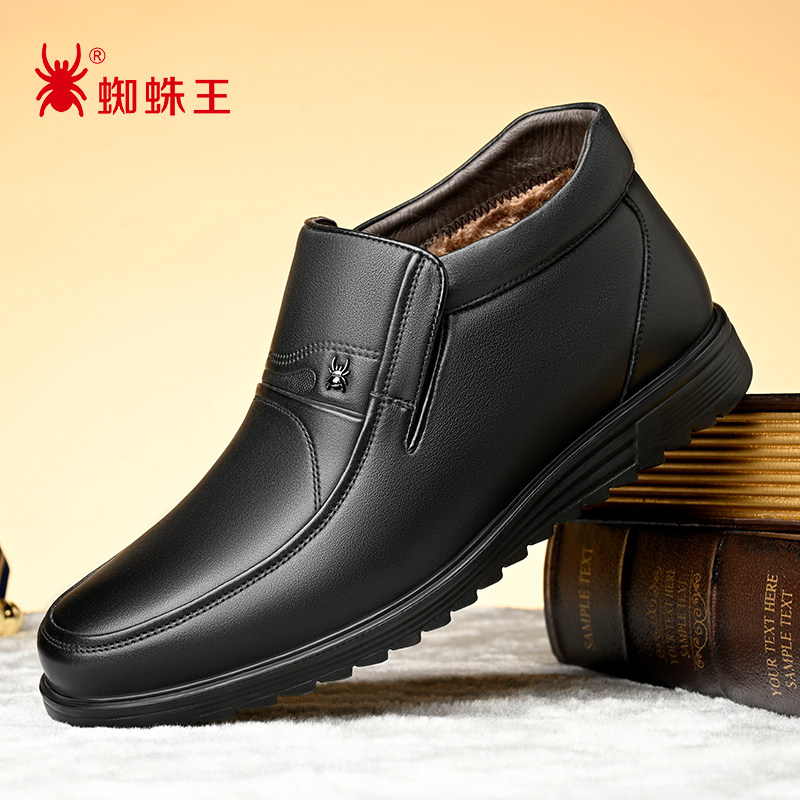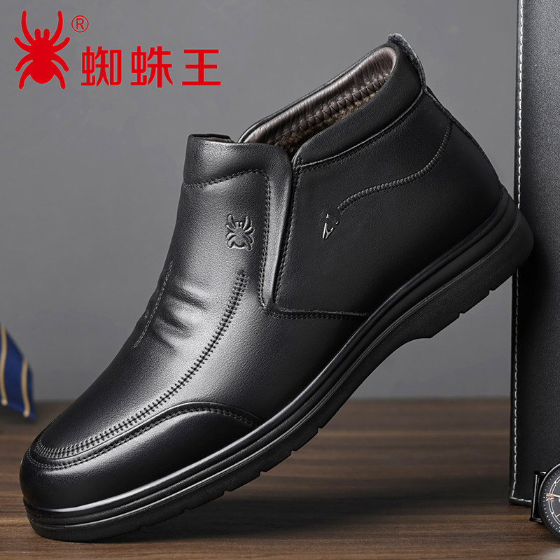 蜘蛛王皮鞋男冬季真皮休闲高帮鞋男棉鞋中老年保暖加绒加厚爸爸鞋