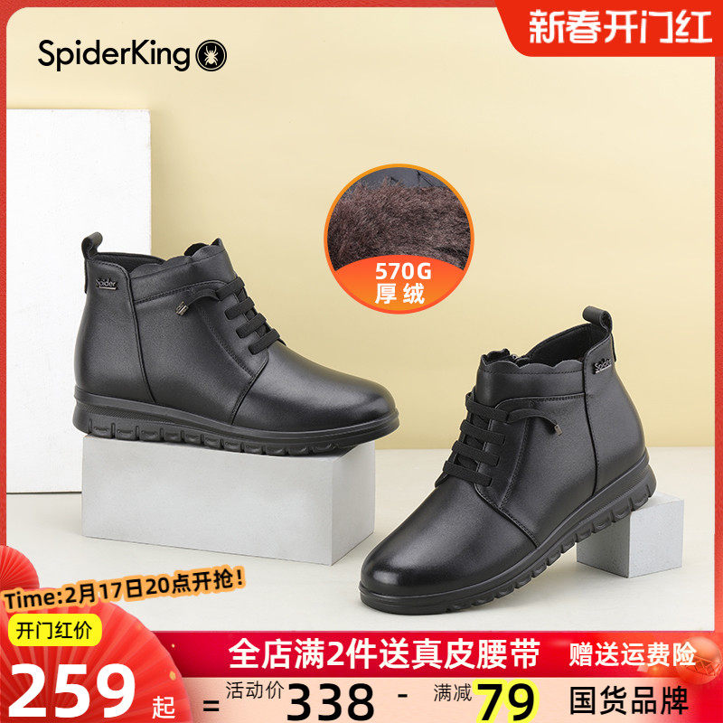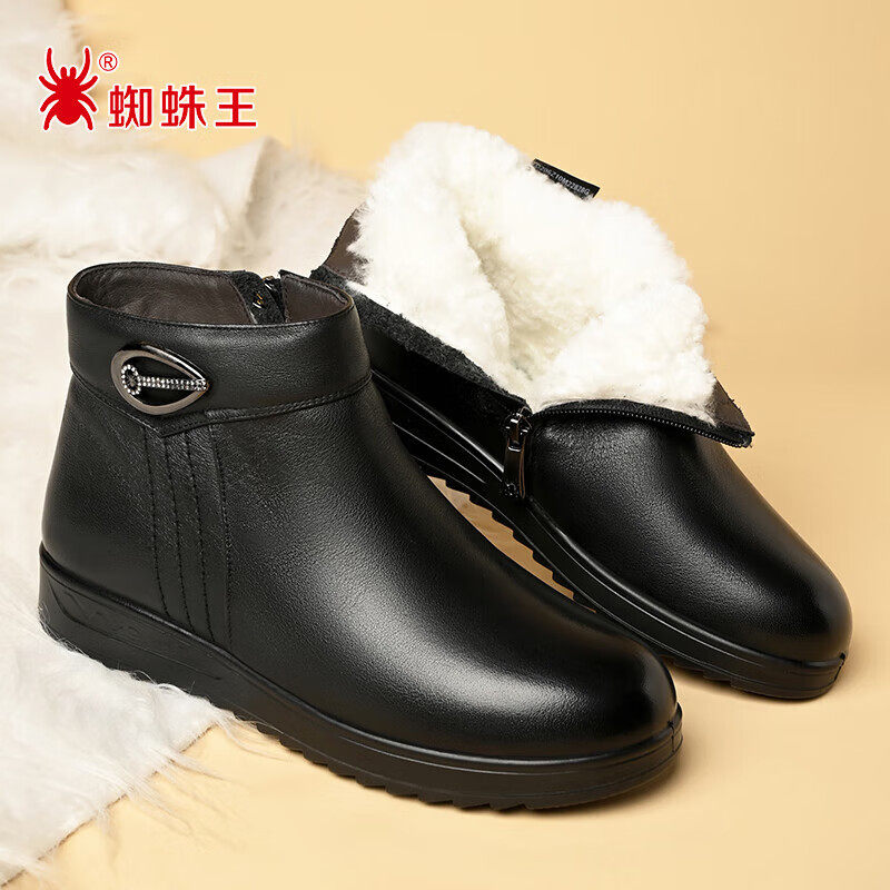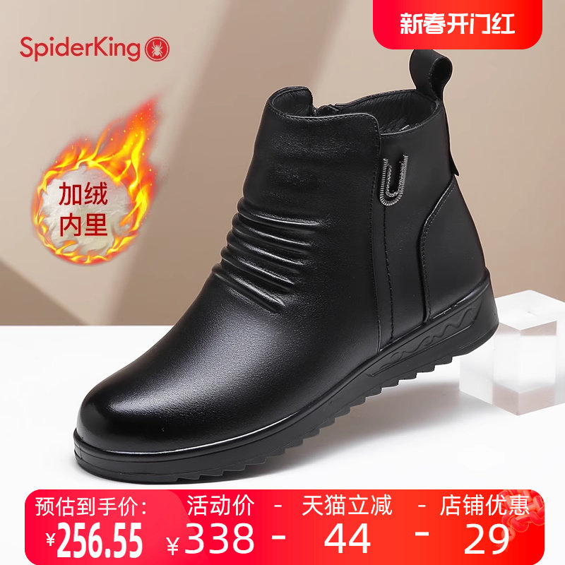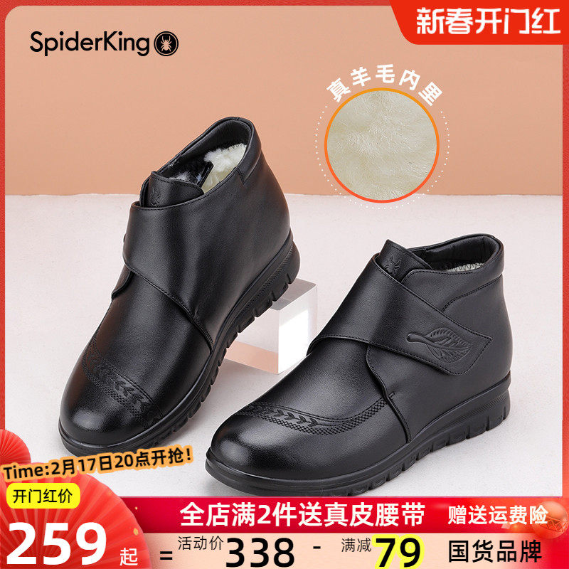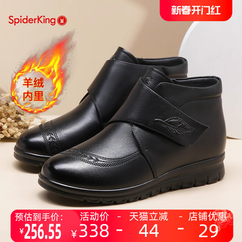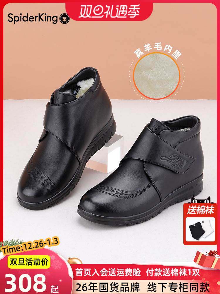 蜘蛛王女鞋冬季新款真皮加厚加绒保暖中老年妈妈棉鞋防滑羊毛短靴