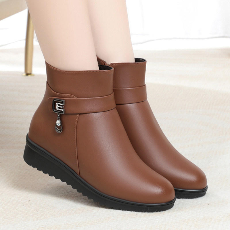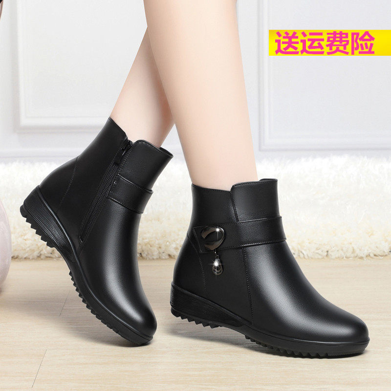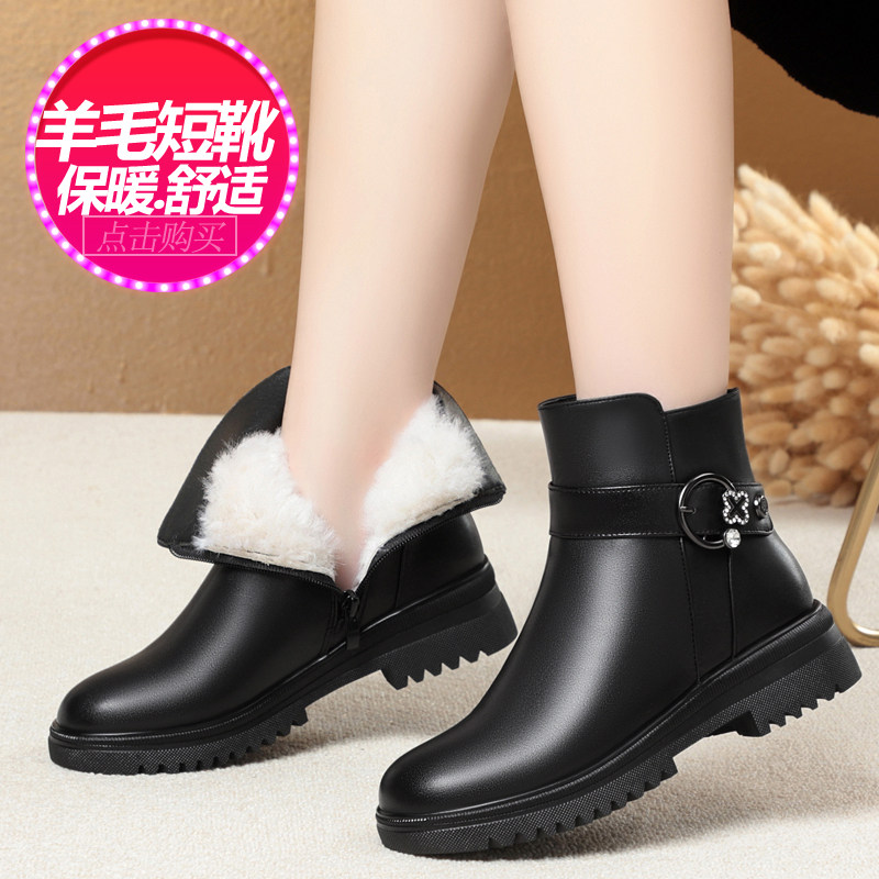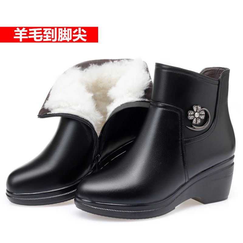 冬季妈妈鞋加绒保暖皮鞋真皮羊毛中老年棉鞋防滑软底短靴中年冬鞋