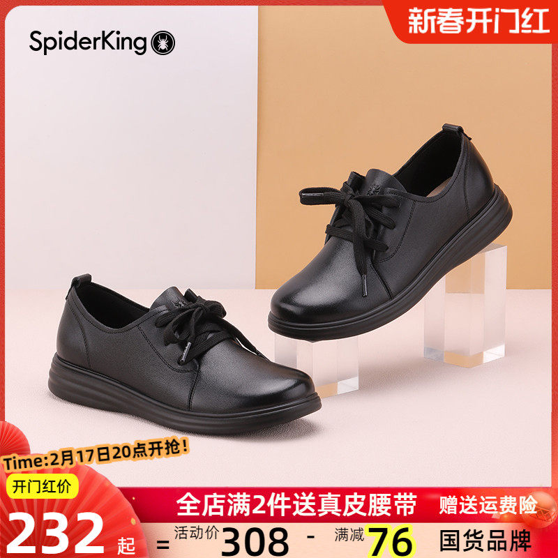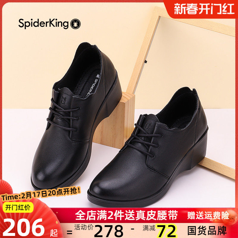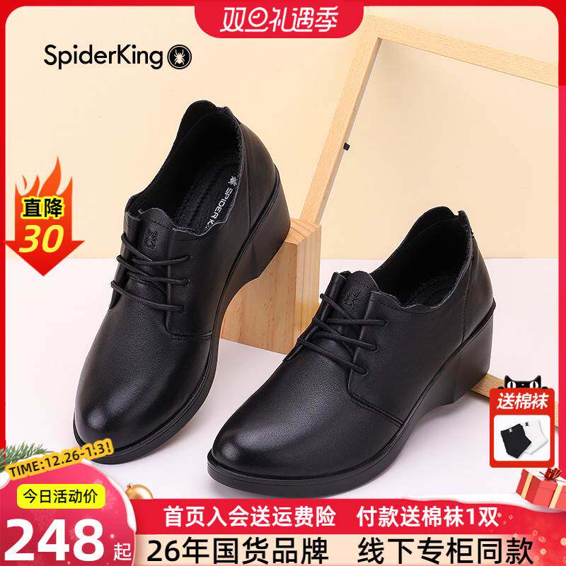 蜘蛛王女鞋秋季新款真皮休闲坡跟牛皮单鞋妈妈鞋中老年系带小皮鞋