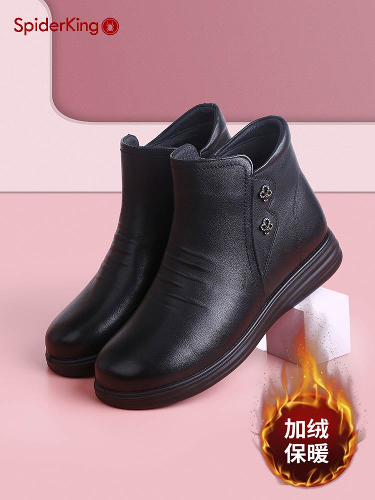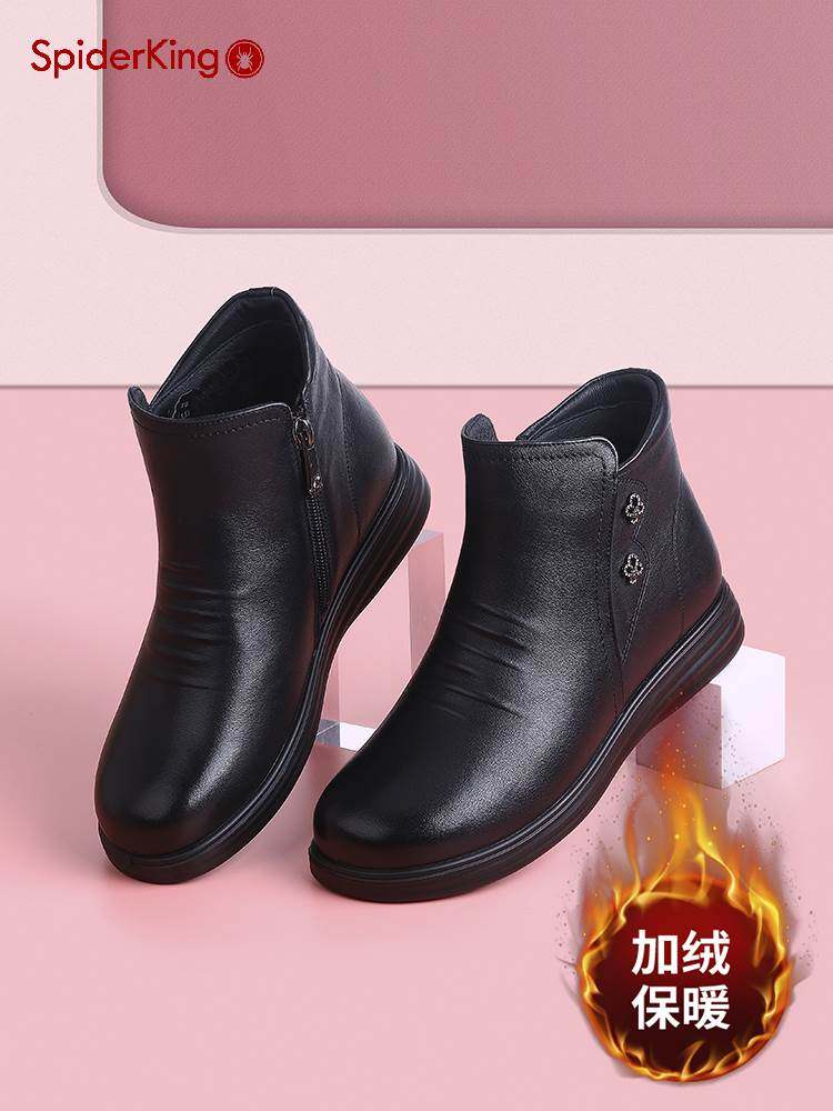 蜘蛛王加绒女鞋秋冬新款妈妈鞋真皮保暖防滑软底中老年女棉鞋短靴