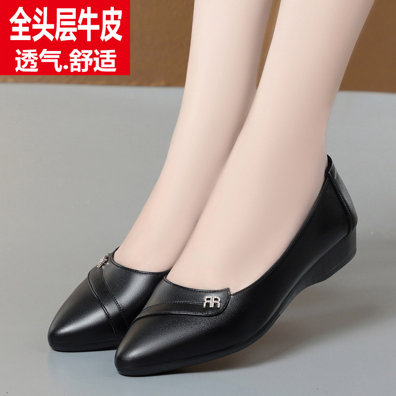 蜘蛛王软皮女鞋春秋款真皮坡跟头层牛皮单鞋中老年妈妈鞋小皮鞋
