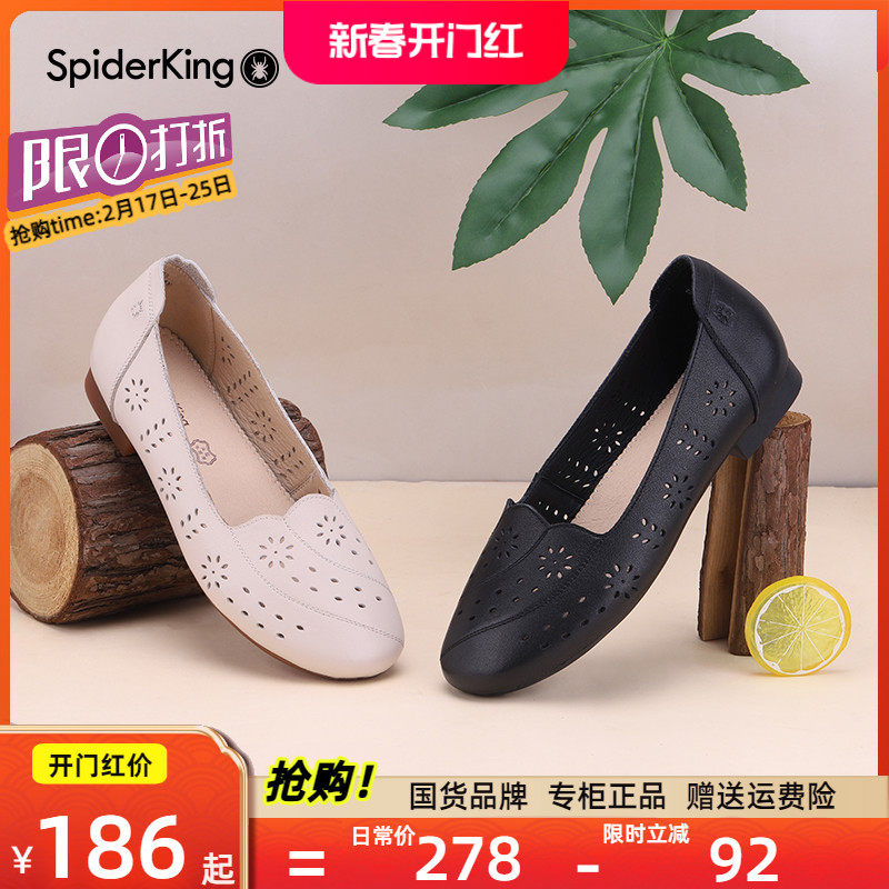 蜘蛛王镂空妈妈鞋女鞋中老年休闲真皮软底舒适平底单鞋防滑小皮鞋