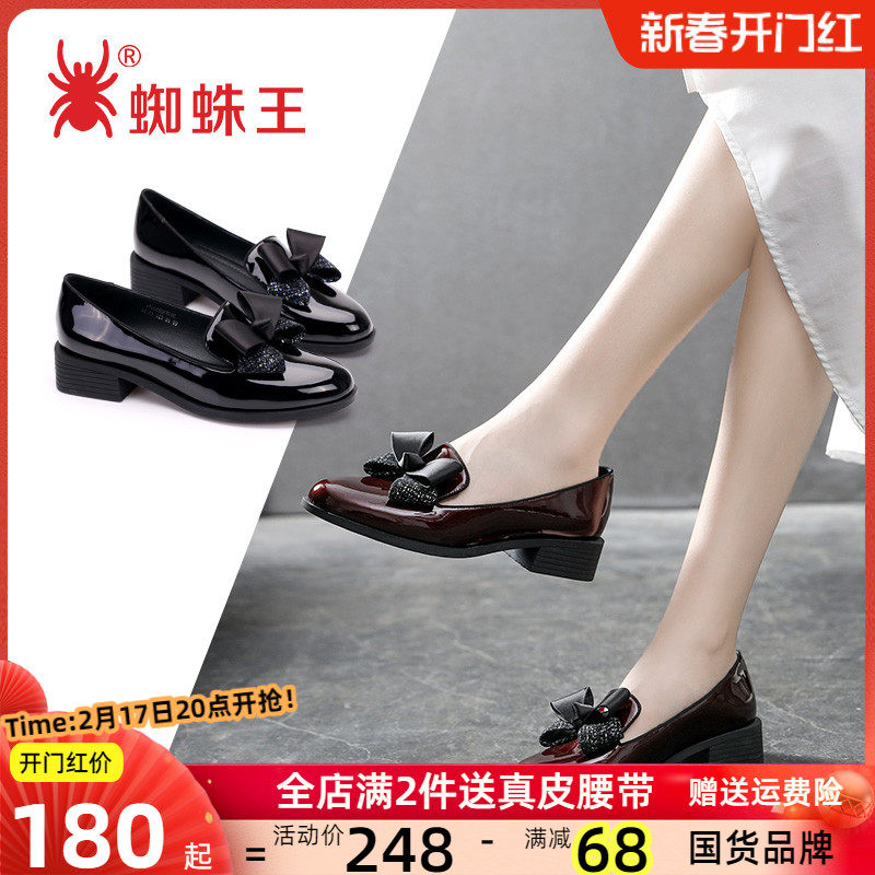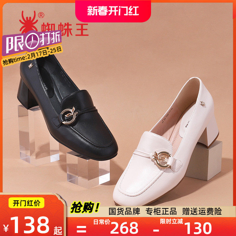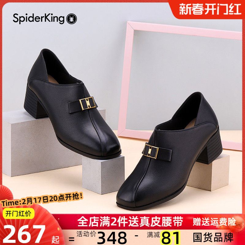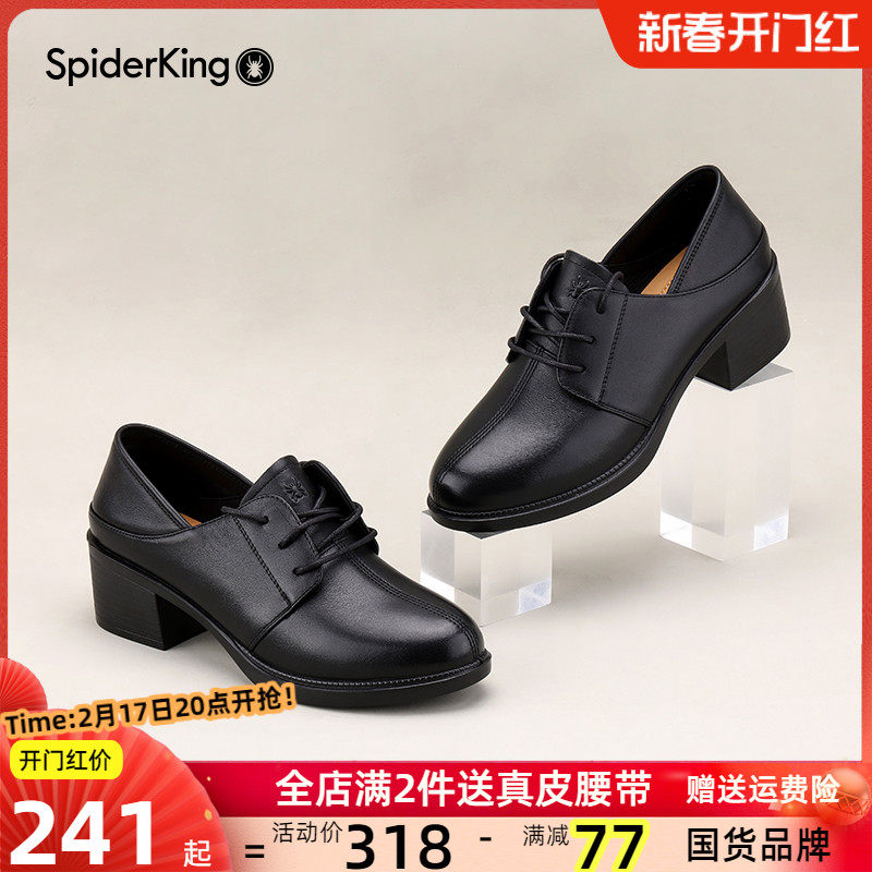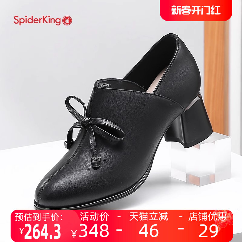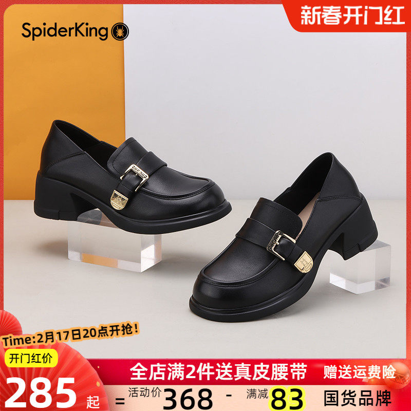 蜘蛛王女鞋2024春季新款女士粗跟小皮鞋职业工作鞋牛皮乐福鞋单鞋